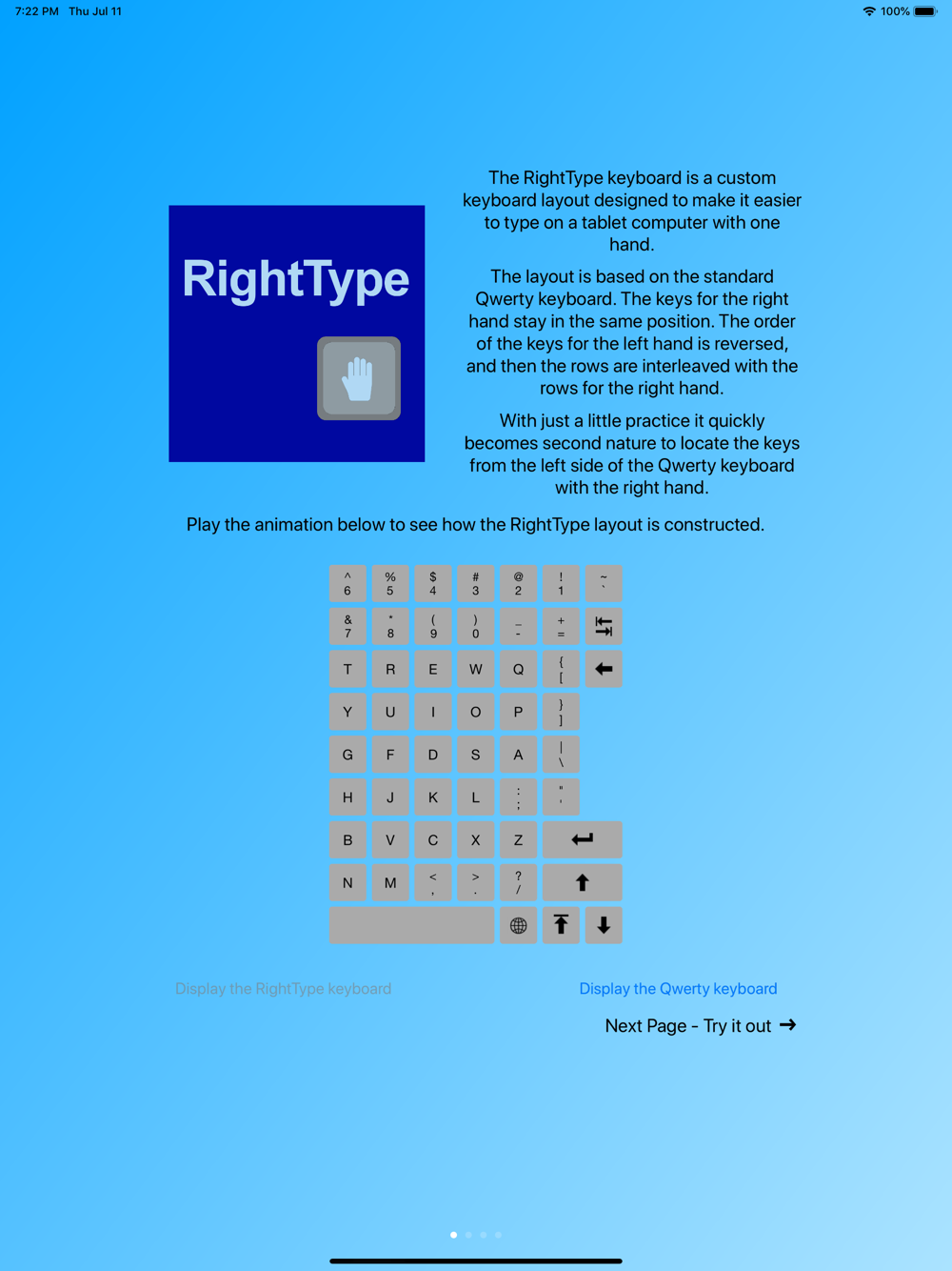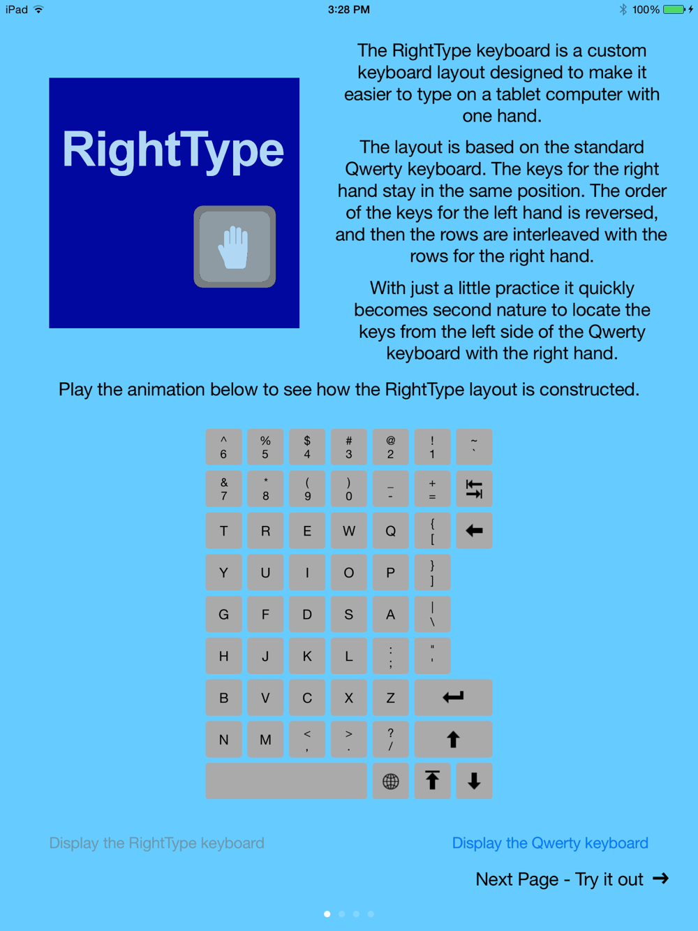 The RightType Keyboard is a custom keyboard layout designed to make it easier to type on a tablet computer with one hand.