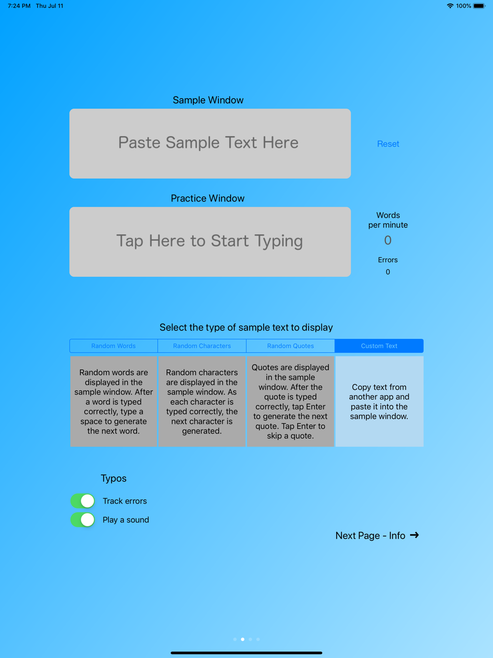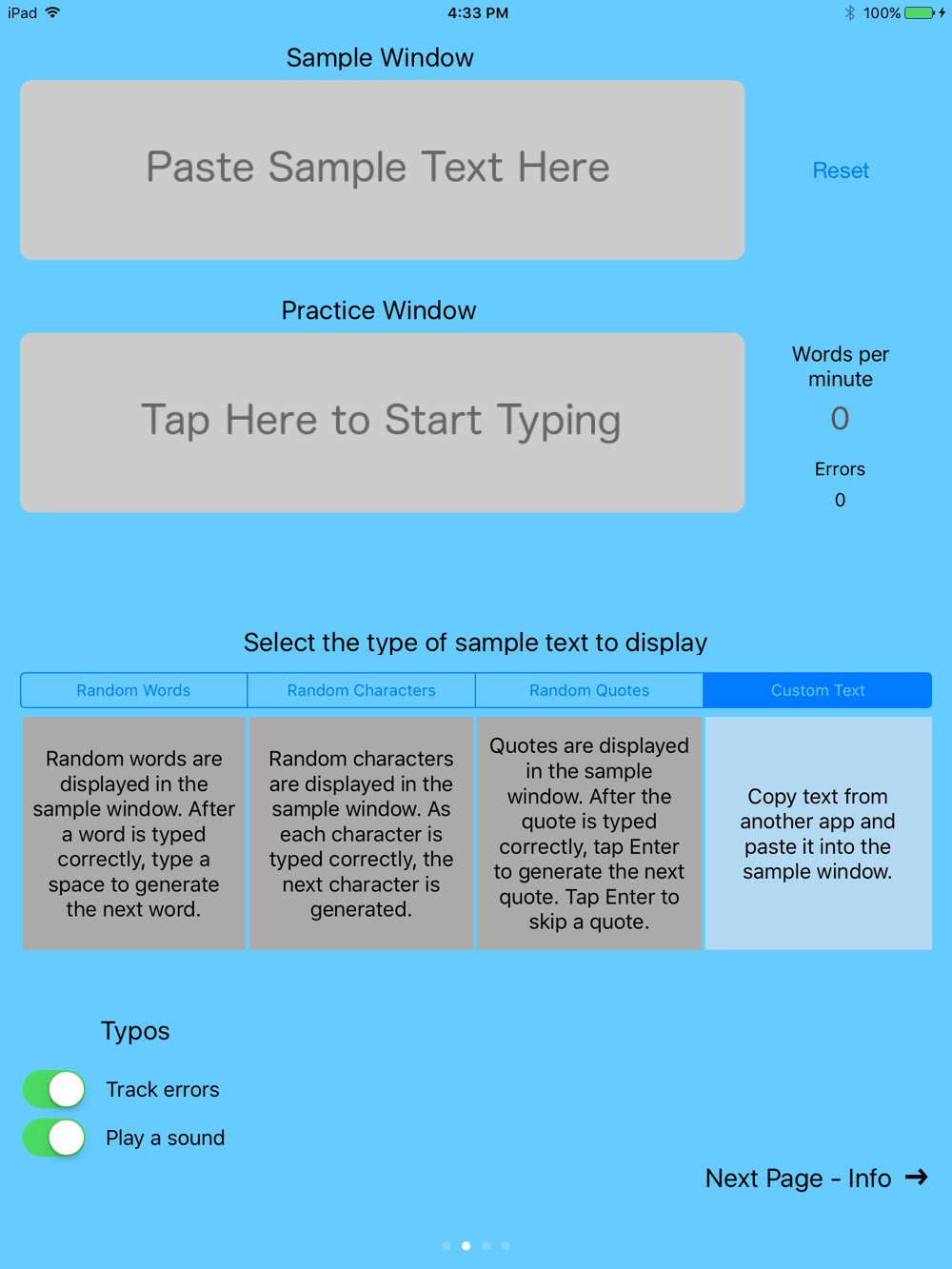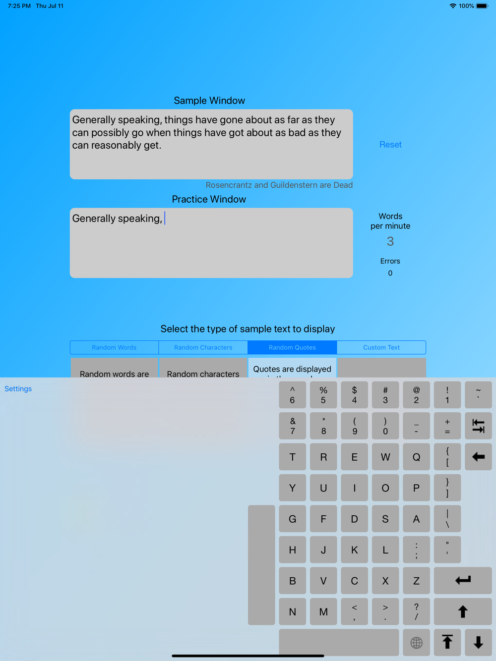 The RightType app displays sample text for practicing with the RightType Keyboard. Options include random words, random characters, and random quotes. Sample text from other apps is also supported. The app tracks how many words per minute are typed and optionally tracks errors.