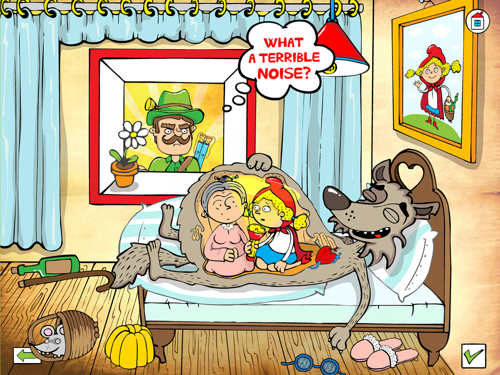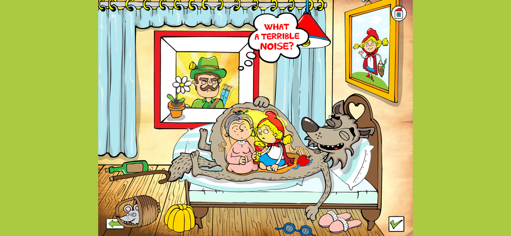 You can decide if you want to listen to the narrator, while your children explore the forest and grandmother´s cottage. Another possibility is to read the interactive book together with your children. The texts in comic balloons will takes you through the story. There are highlighted areas for children's restless fingers and vivid imagination. All objects in the scenes are beautifully animated and accompanied by sound. It is amusing to touch the individual parts of the picture.