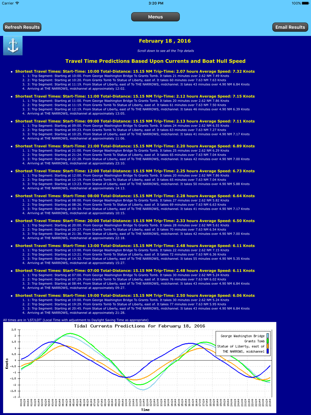 And now for the power of this app… You will be given a few choices on what time you should leave and what time you will arrive based on the tidal currents from the start of your trip to the end. Pick the quickest trip and save time and money on fuel!