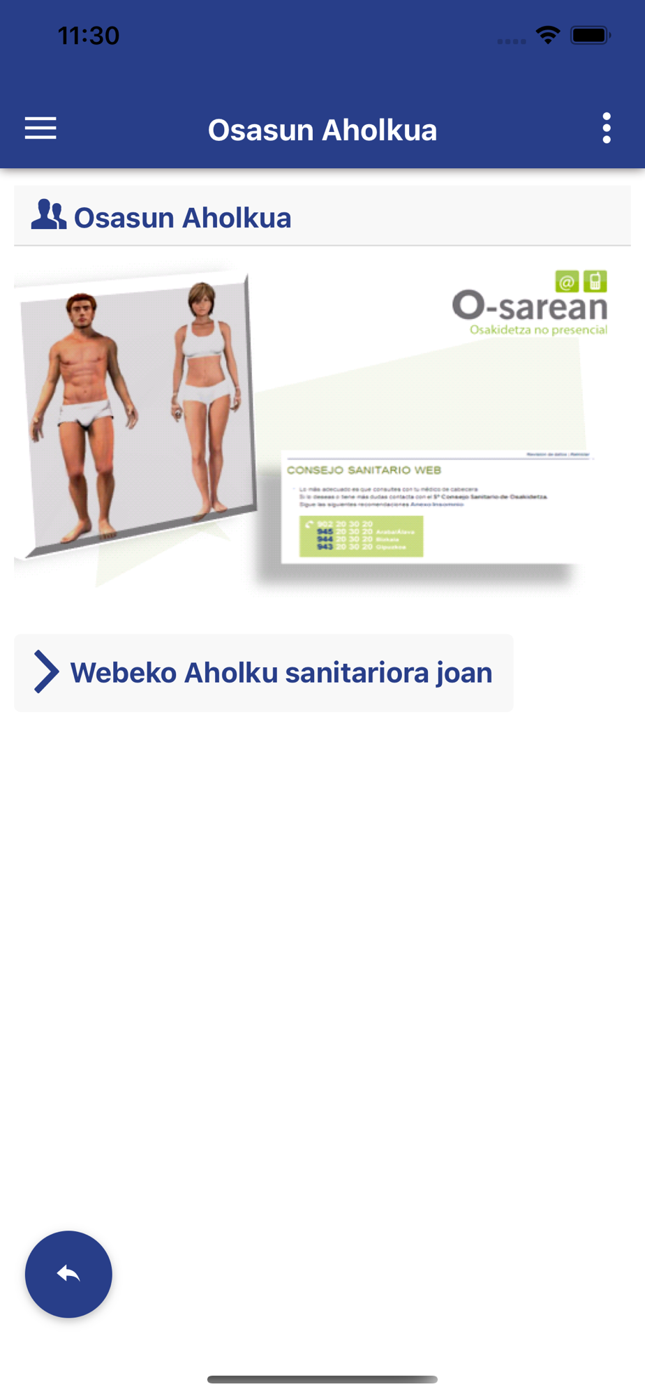 * Osasun-karpeta: Hemendik modu seguru eta konfidentzialean kontsultatu ahalko dituzu: informazio sanitarioa, txostenak, medikazioa, hurrengo hitzorduak... eta zure osasunerako interesgarriak izan daitezkeen edukietara sartu ahalko zara.