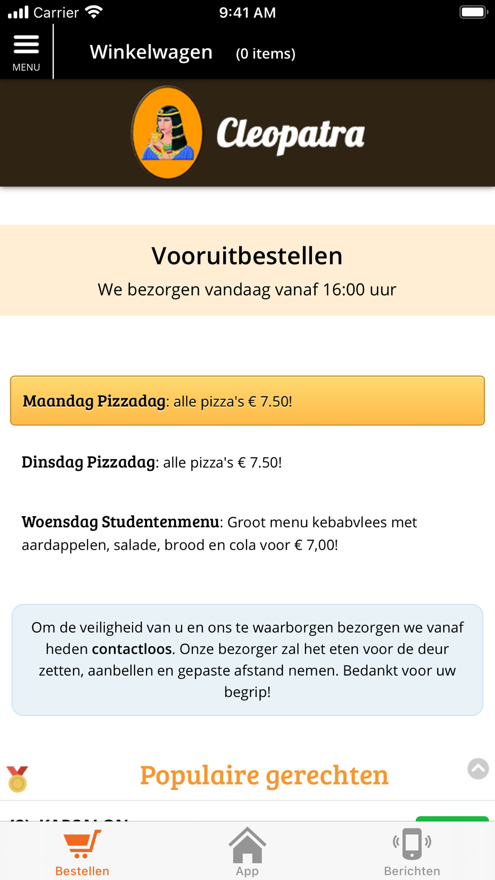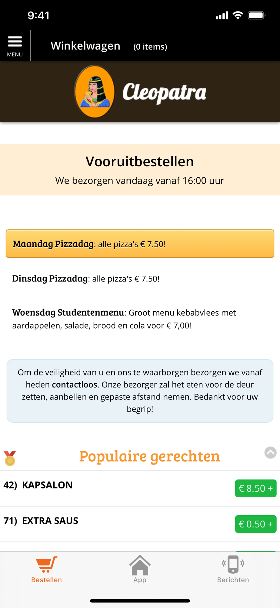 Download onze app en blijf op de hoogte van het laatste nieuws en de nieuwste acties, aanbiedingen en kortingen. Via onze app kunt u onze menukaart bekijken en direct vanaf uw telefoon uw bestelling plaatsen. U kunt via de app ook met iDEAL betalen!