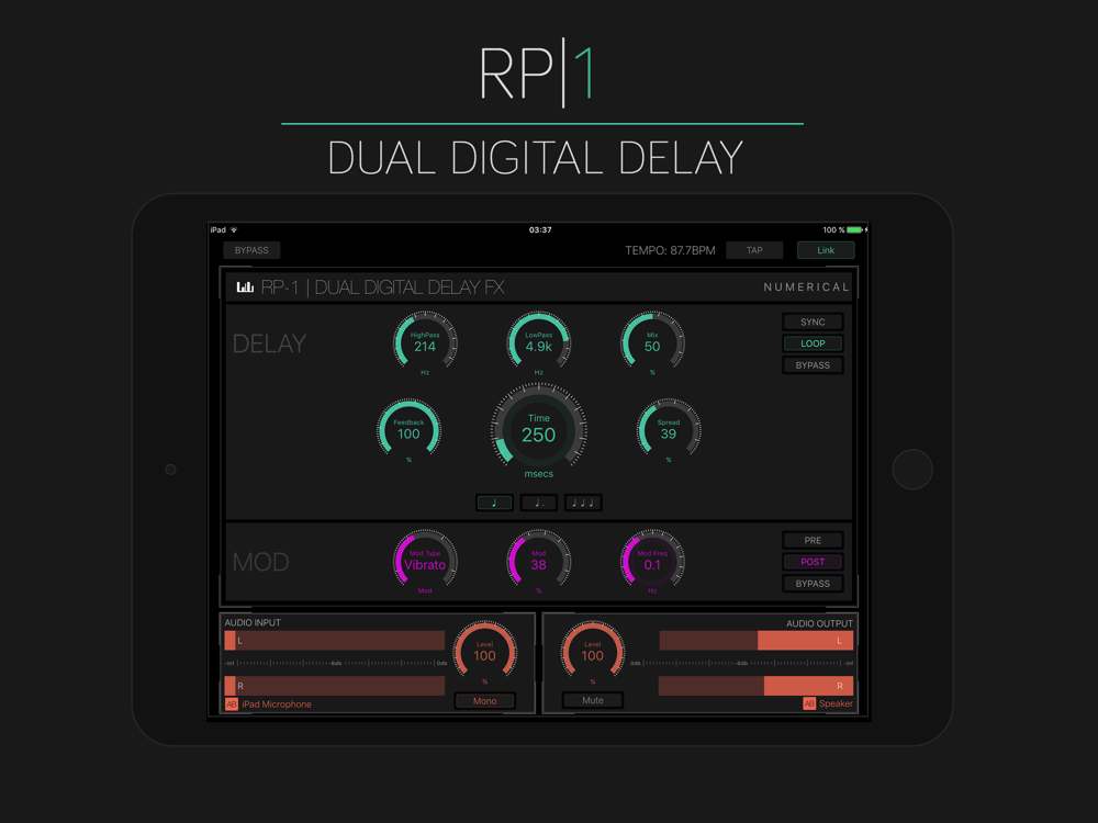 - Delay Times from 10ms to 2000ms (or 1/32 to 2bars)