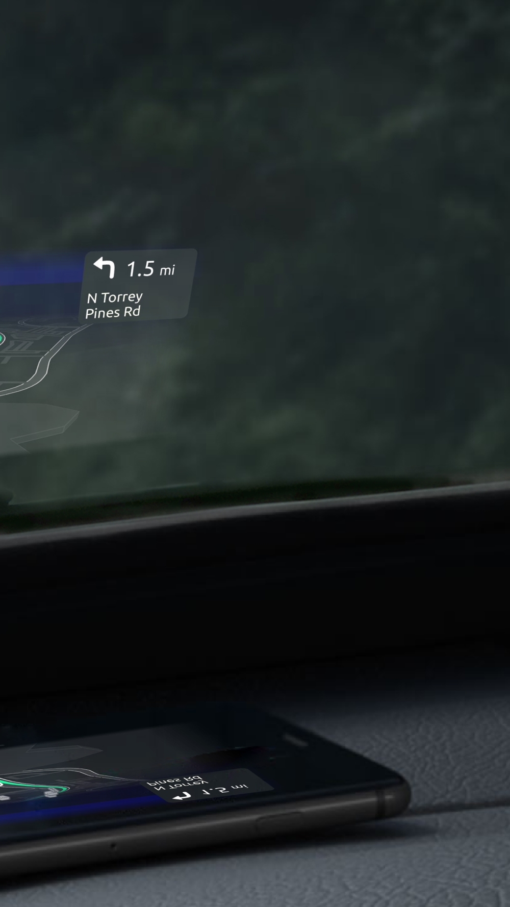 Set your destination, select the route and place your phone on the dash — to see the route reflected on your windshield. Keep your eyes on the road and know in advance what’s ahead — a straight run, or a sharp turn. The dark windy unknown roads become more predictable this way.