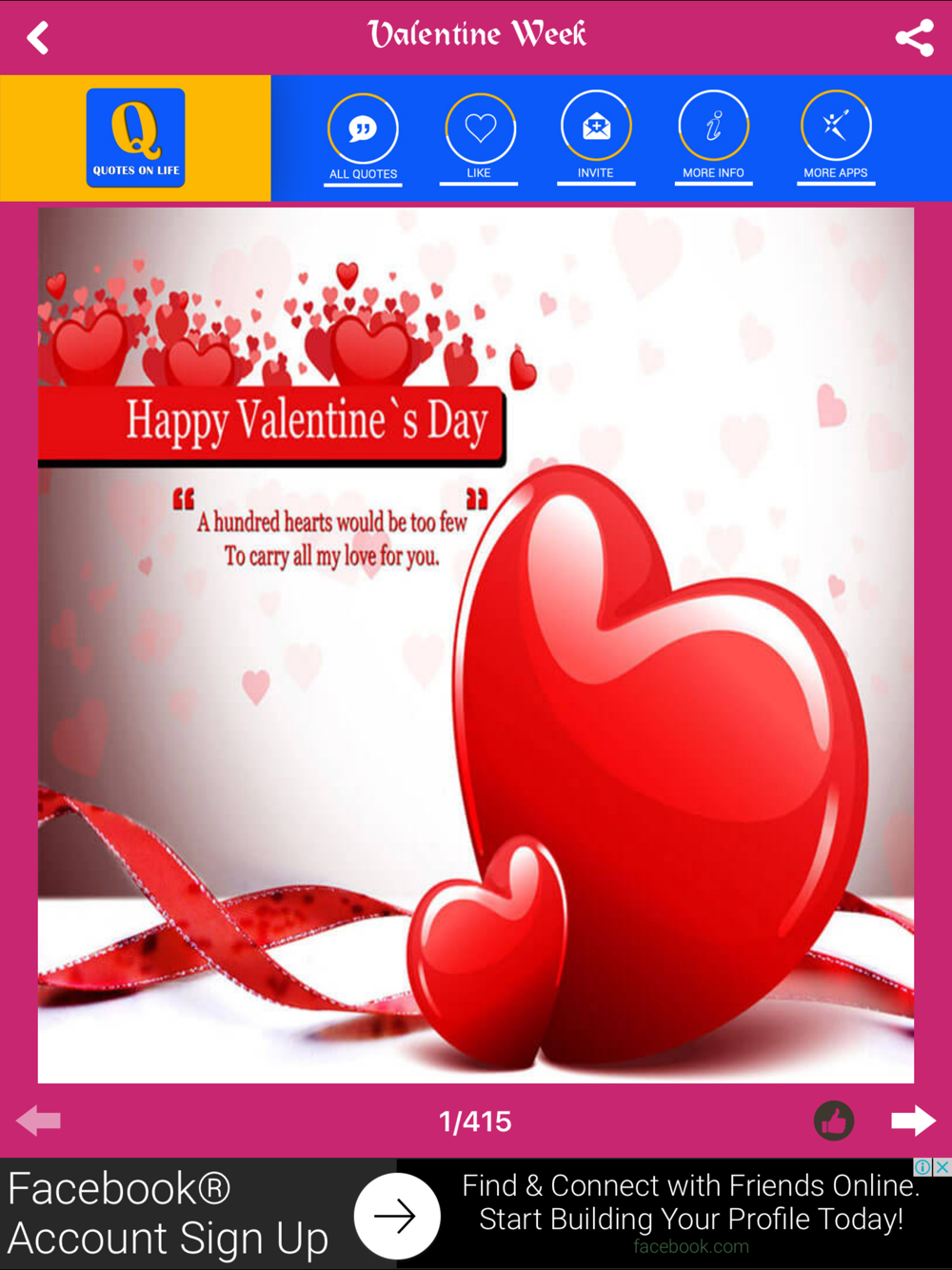 2. Finger swipe option to change pages to see previous and next Valentine quote.