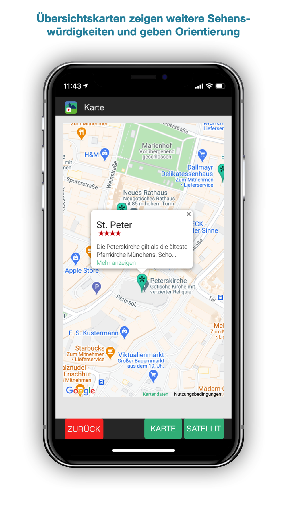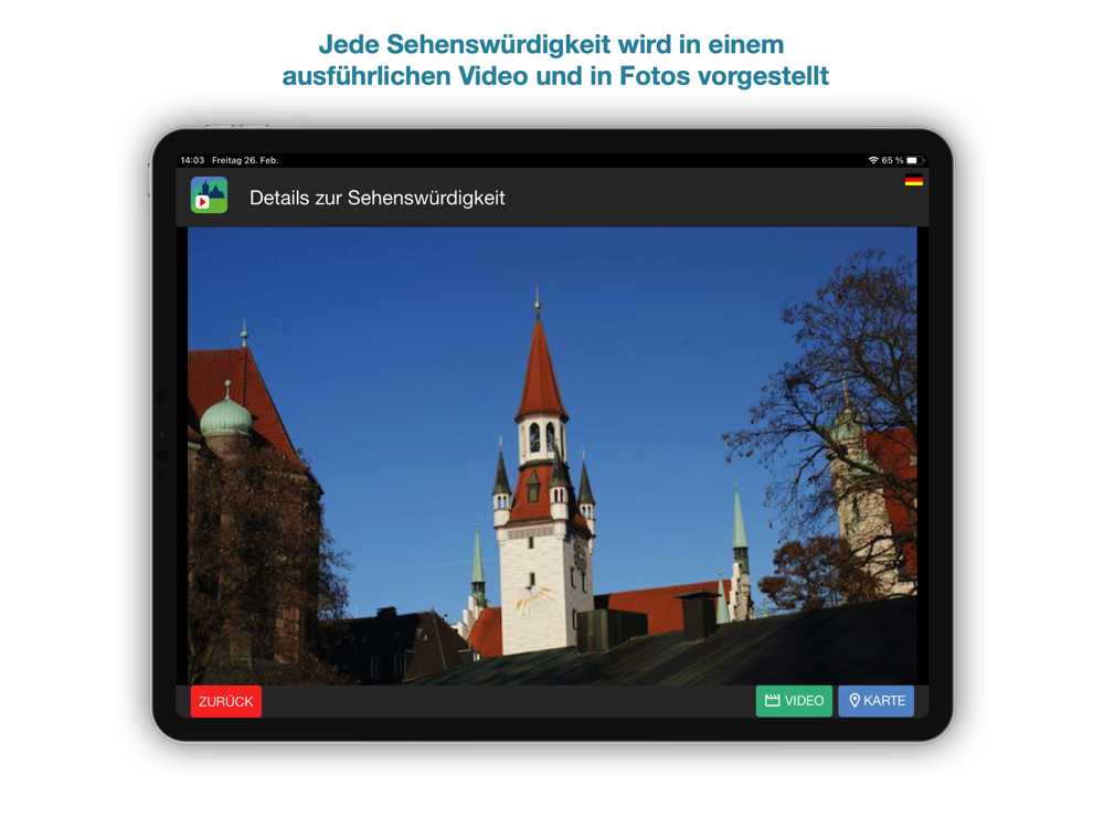 Anhand von mehr als 2500 aufwendigen Bilddokus (Dauer je 2-5 Min.) erläutert ein professioneller Sprecher Sehenswürdigkeiten in über 100 deutschen Städten. Von A wie Aachen bis W wie Würzburg.