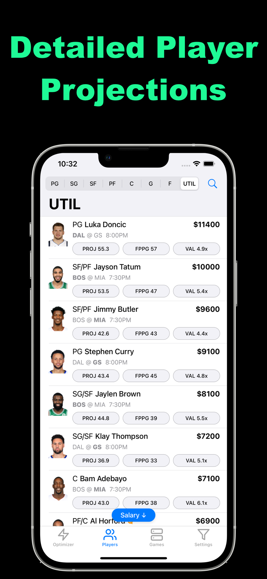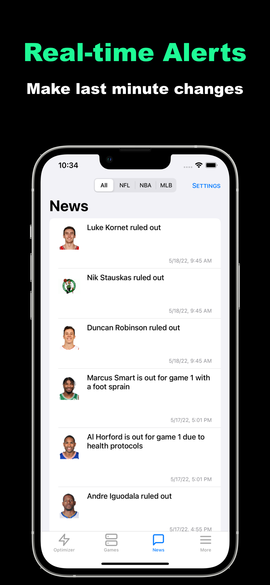 We provide real-time projections and injuries to build your lineups with confidence and send news updates via push notifications to allow you to make last-second decisions that will make or break your lineups.