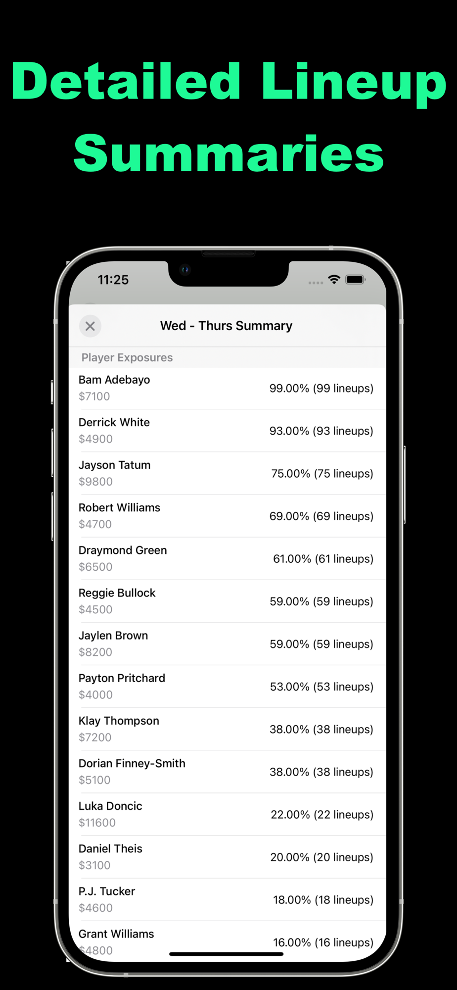 - Generate lineup summaries with player exposures and team exposures.