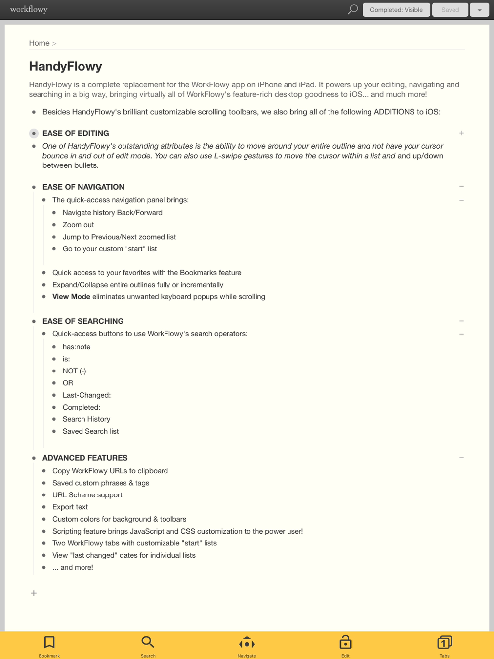 HandyFlowy is a complete replacement for the WorkFlowy app on iPhone and iPad. It powers up your editing, navigating and searching in a big way, bringing virtually all of WorkFlowy's feature-rich desktop goodness to iOS... and much more!