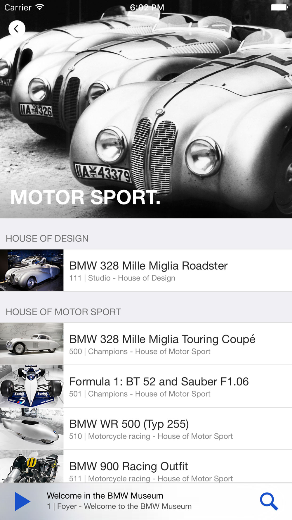 BMW 博物馆应用程序让用户可体验该品牌历史中的各个面向、主题与时代,深入了解每个细节。用户也可在造访博物馆的各个场馆(顺序自订)时使用此应用程序作为导览。各个展览的说明均可以语音形式进行,有如手持博物馆常见的语音导览一般。另外,串流的内容也可以文字形式阅读,并配上该展览的图片,在用户的装置上即可一览无遗。还有交互式地图,让用户可更有效率地在各区域之间移动。