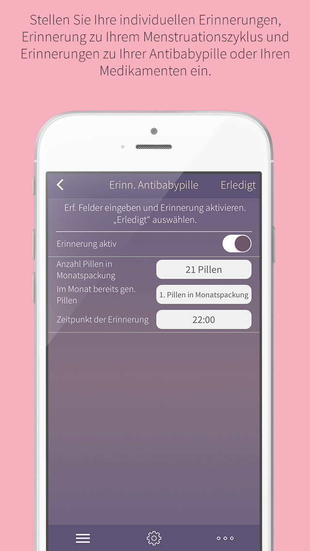 - Stellen Sie Ihre individuellen Erinnerungen ein: Menstruationszyklus, Folgerezept, jährlicher Check-Up, Verhütungsmittel oder andere Medikamente