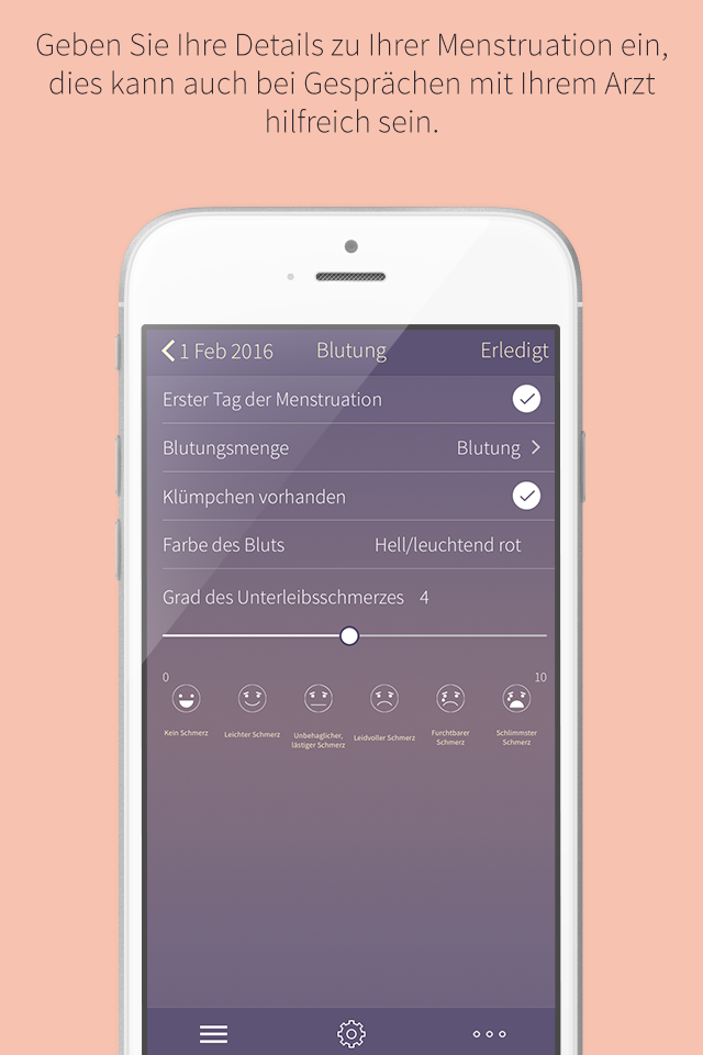 - Detaillierte Nachverfolgung von Menstruationsblutungen, Zwischenblutungen und aufgetretenen Schmerzen