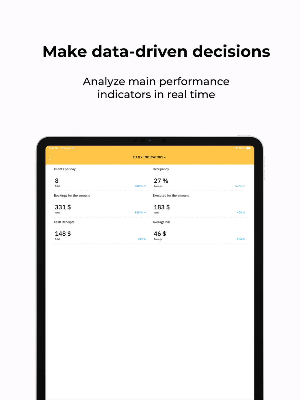 — Analyze your business performance for any day or selected period: revenue, employee efficiency and more;
