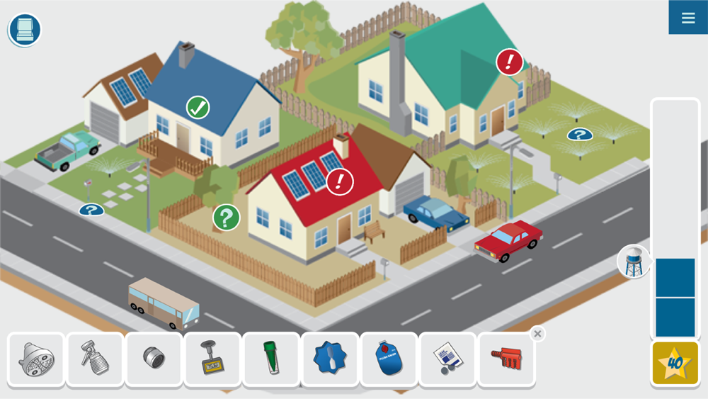 Become a Water Detective and help neighborhoods across Texas become more water-efficient by identifying ways each home can save water. Install efficiency products in each home and answer trivia questions to learn more about water conservation and water-saving behavior changes. Trivia questions and game scenarios are derived from the Harris-Galveston and Fort Bend Subsidence District Water Detective program’s Student Guide.