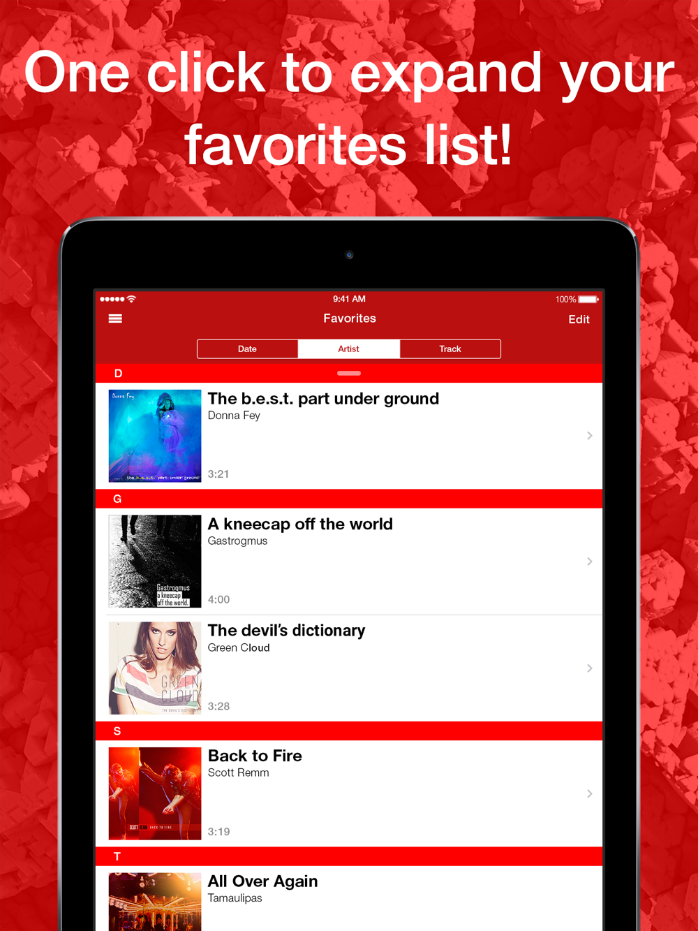 • Easily add tracks to your favourite by simply clicking the «heart» icon.