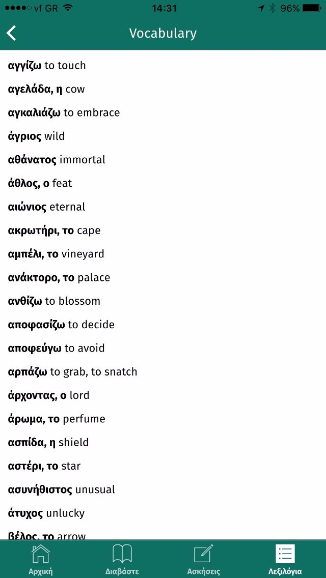 You will see the titles of the chapters so that you can get an idea of the contents. As you read through, you will find words or phrases in bold letters. Their explanations can be found in the Λεξιλόγια (Vocabularies) section.