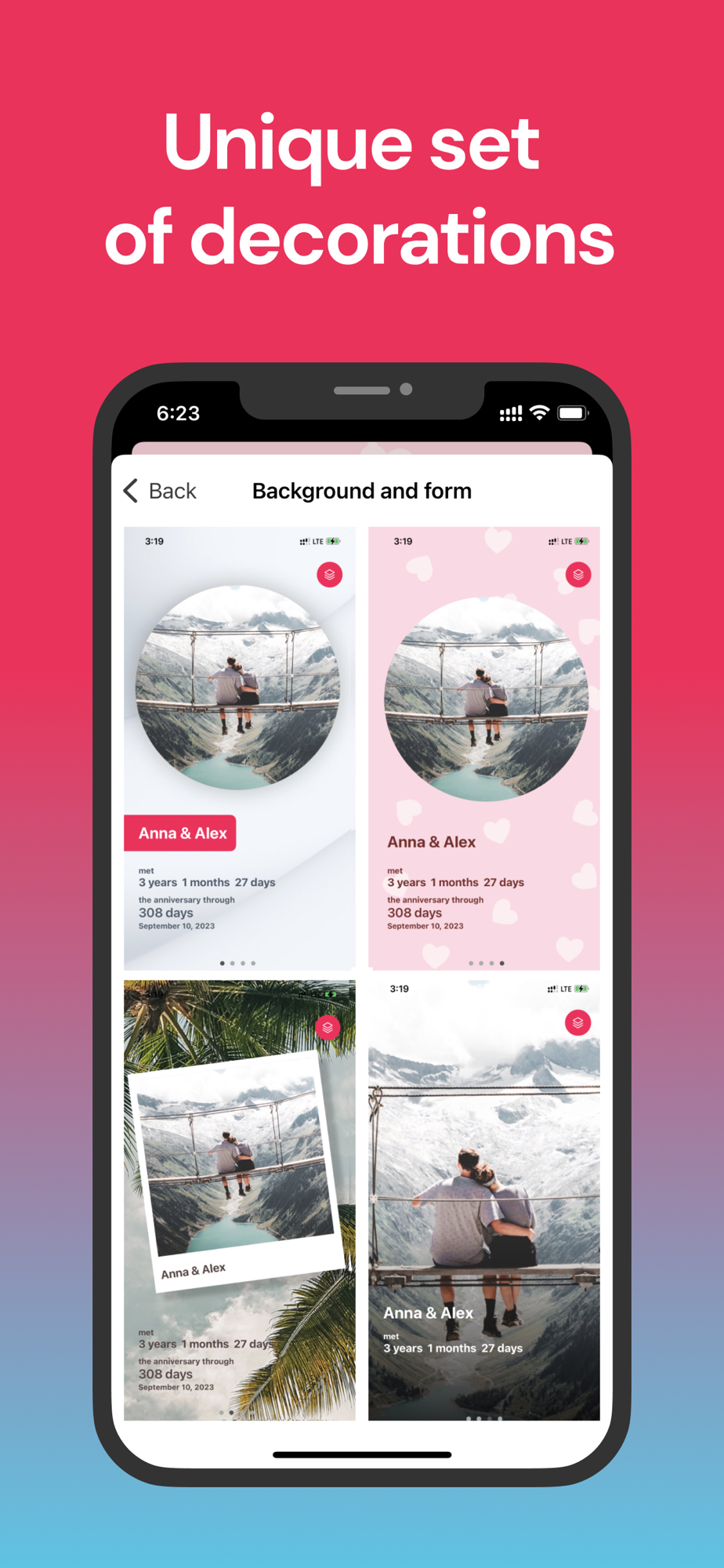 Indicate the date of the beginning of the relationship in the calendar, set a photo as a background and find out how many days you have been together or how many days until the anniversary. Choose your favorite design options for the love counter to make it unique.