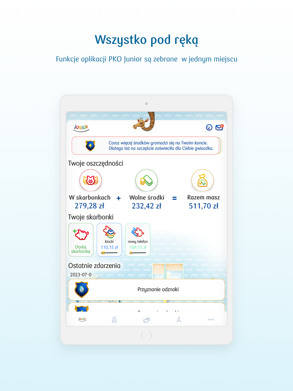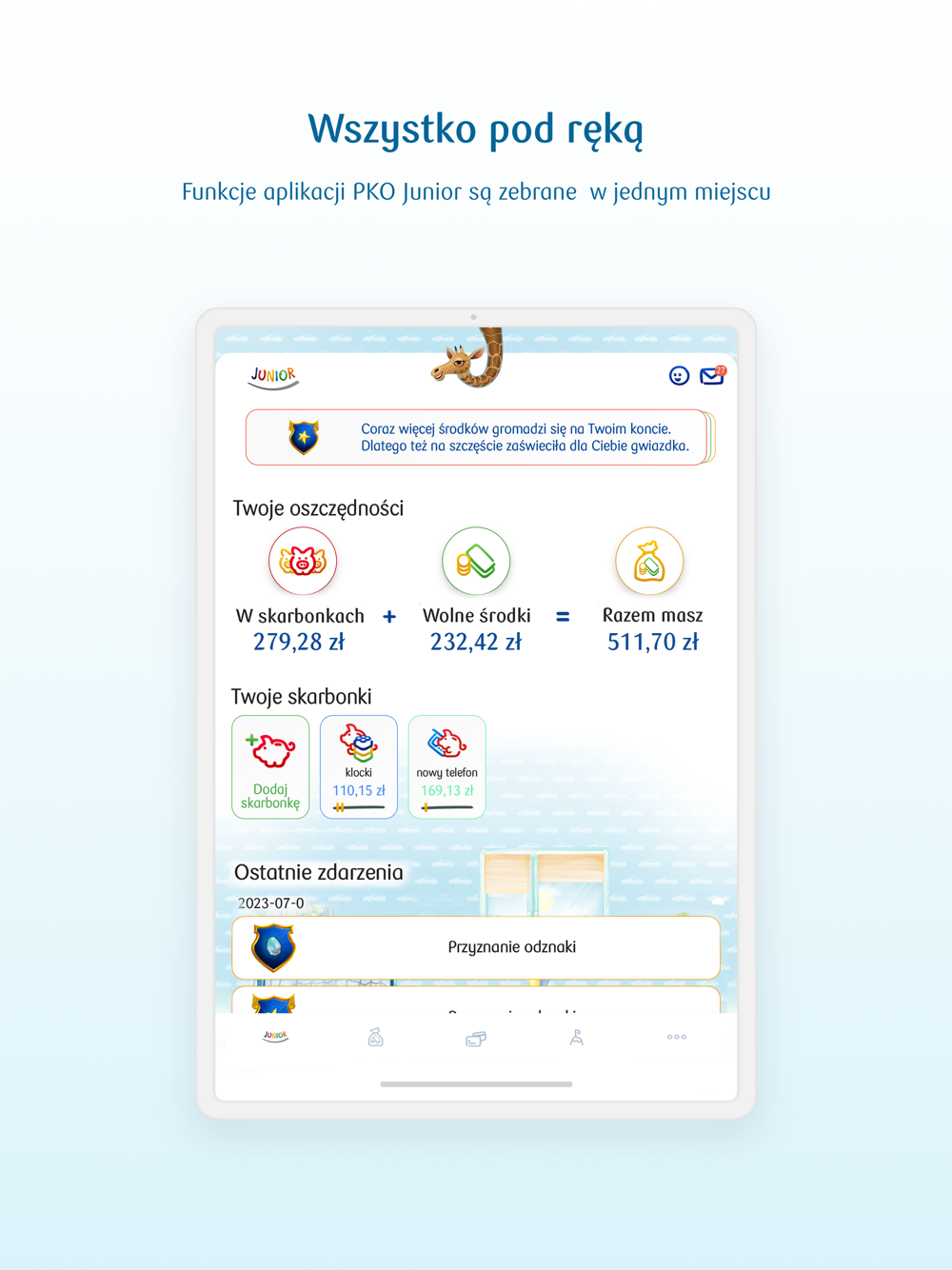 Aplikacja PKO Junior jest stworzona dla dzieci do 12. roku życia, które mają PKO Konto Dziecka w PKO Banku Polskim. Uczy dzieci zarządzania budżetem w telefonie pod kontrolą rodziców.
