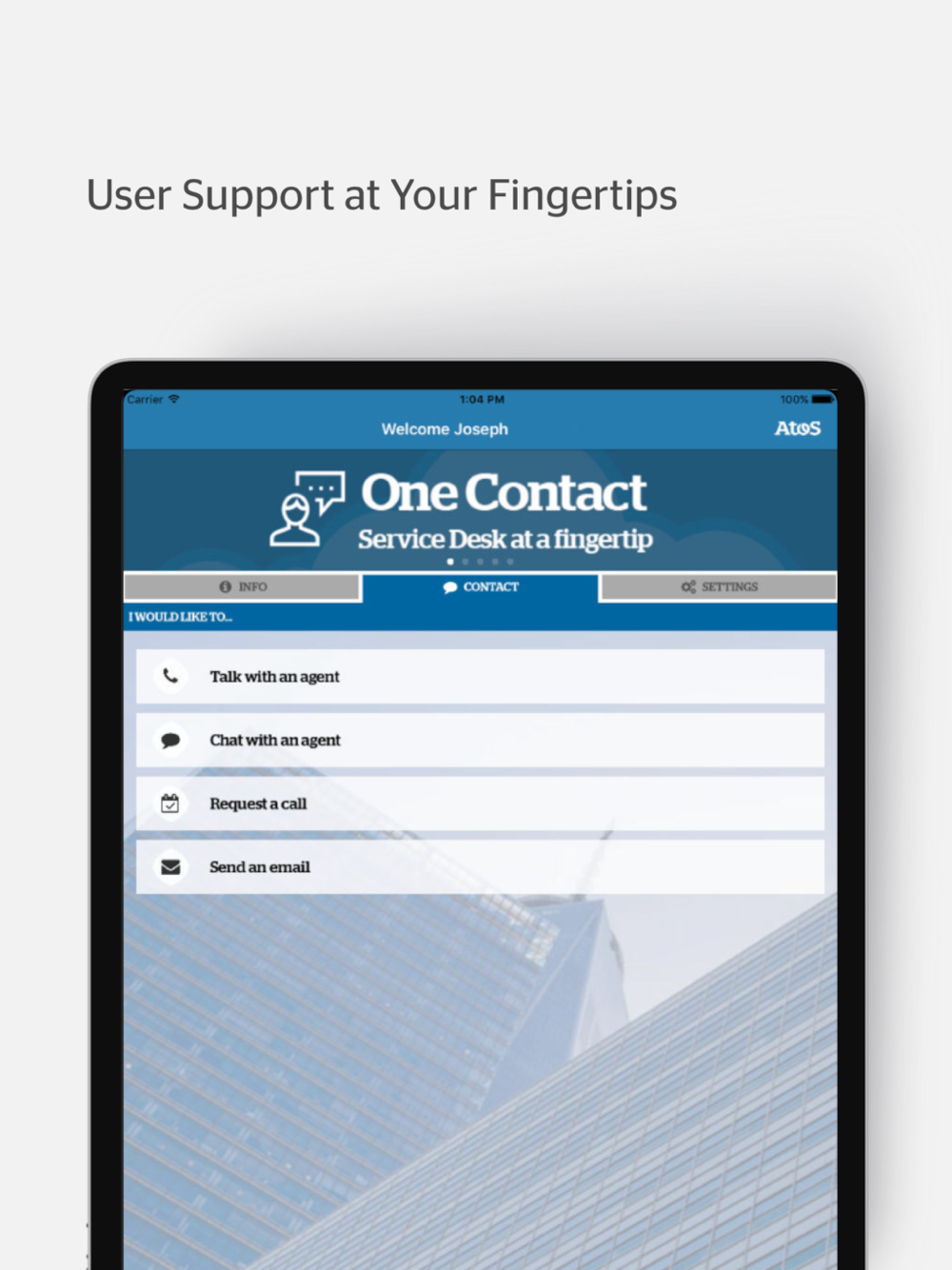 Atos OneContact is a unified user support solution. For end-users, it provides access to user support right at the fingertip with multiple communication channels – chat, voice, callback and email – anytime, anywhere and on any device. The application has been designed to support different location and languages. Atos OneContact is proactive in providing up to date information that’s relevant to you such as news, disruption, and maintenance.
