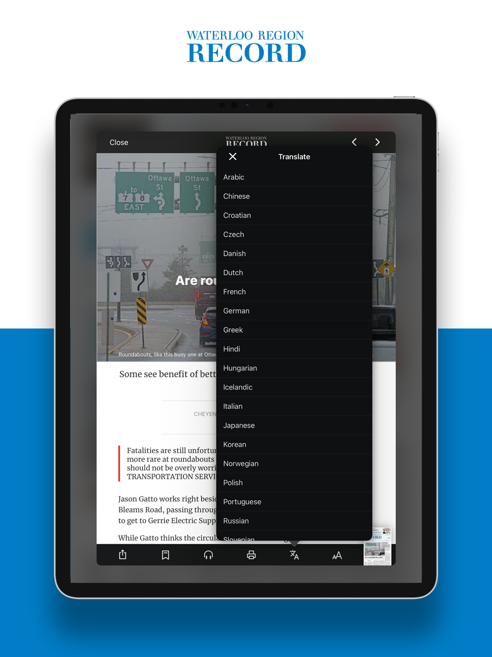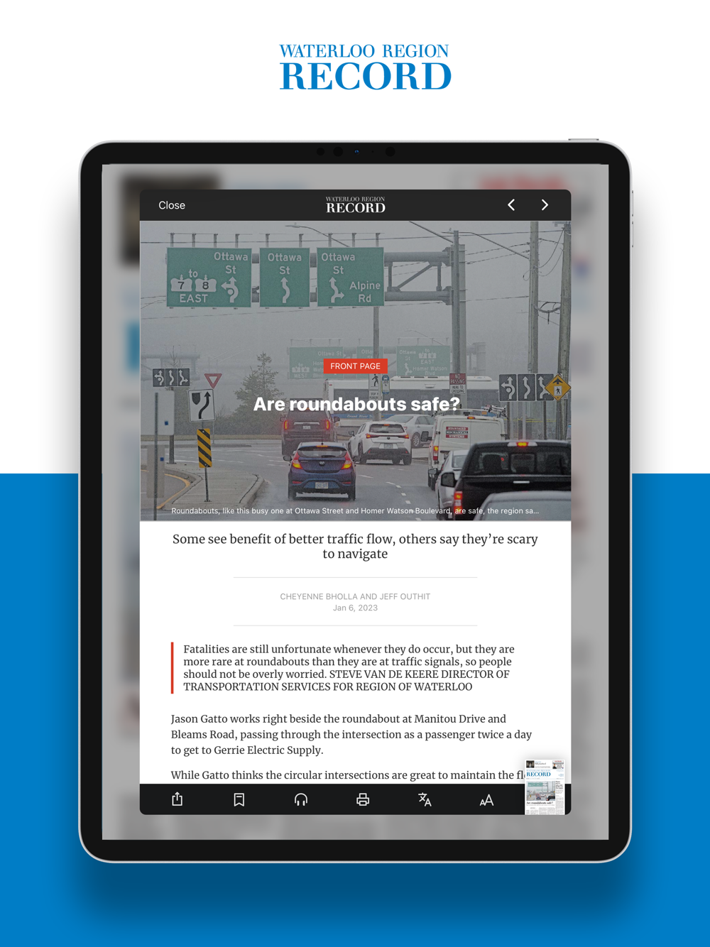 With The Waterloo Region Record ePaper, you can read The Record online in its true printed format from anywhere in the world. Along with the newspaper-like feel of flipping through pages and sections, you can also use electronic enhancements such as keyword search, or access editions of the newspaper from up to 6 months prior. Plus, the ePaper edition is social; you can share articles, from a trusted source, with friends and colleagues via Facebook, Twitter, and email.