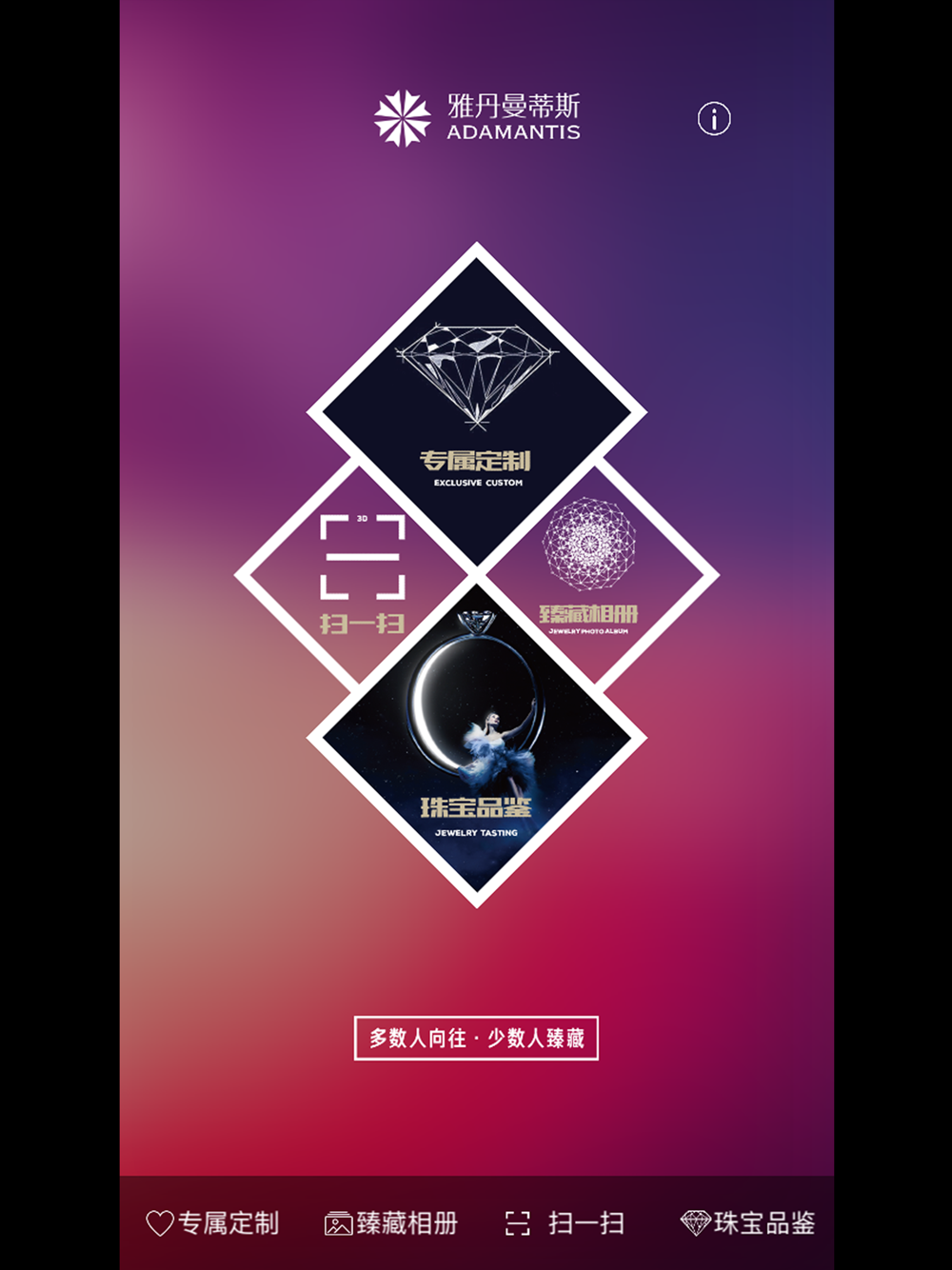 adamantis增强现实钻戒体验应用,通过AR(增强现实)技术将闪亮的钻戒呈现在面前,从各个角度体验Adamantis的钻戒。3D可视化的钻戒私人订制功能,个性订制出自己唯一的钻戒。多数人向往,少数人臻藏。