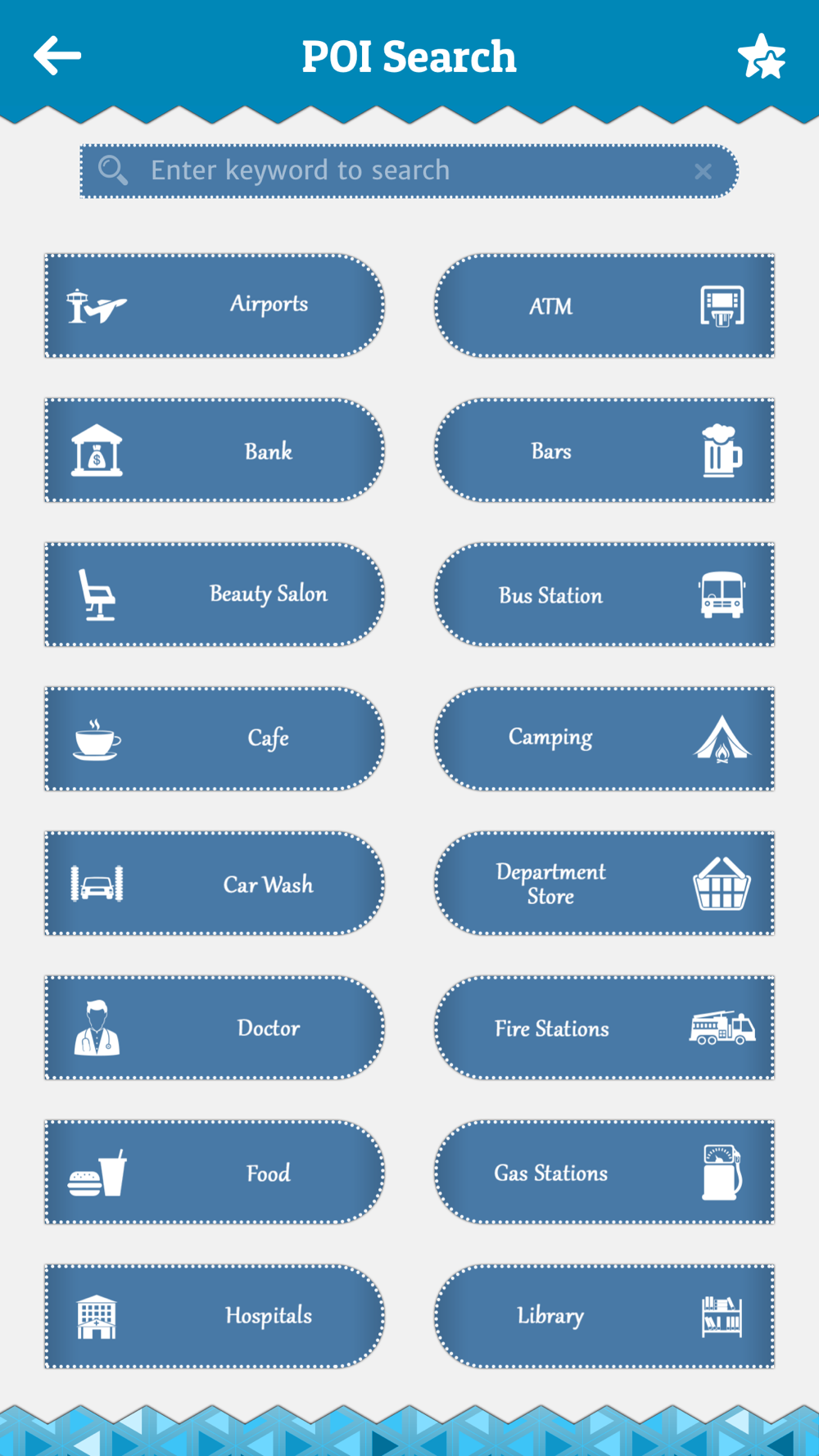 √ Predefined & POI searches are available. It brings your Device one step closer to a full feature GPS system. It has a database pre-populated with more than 1200 POI categories. You can find the places you are looking for without any typing.