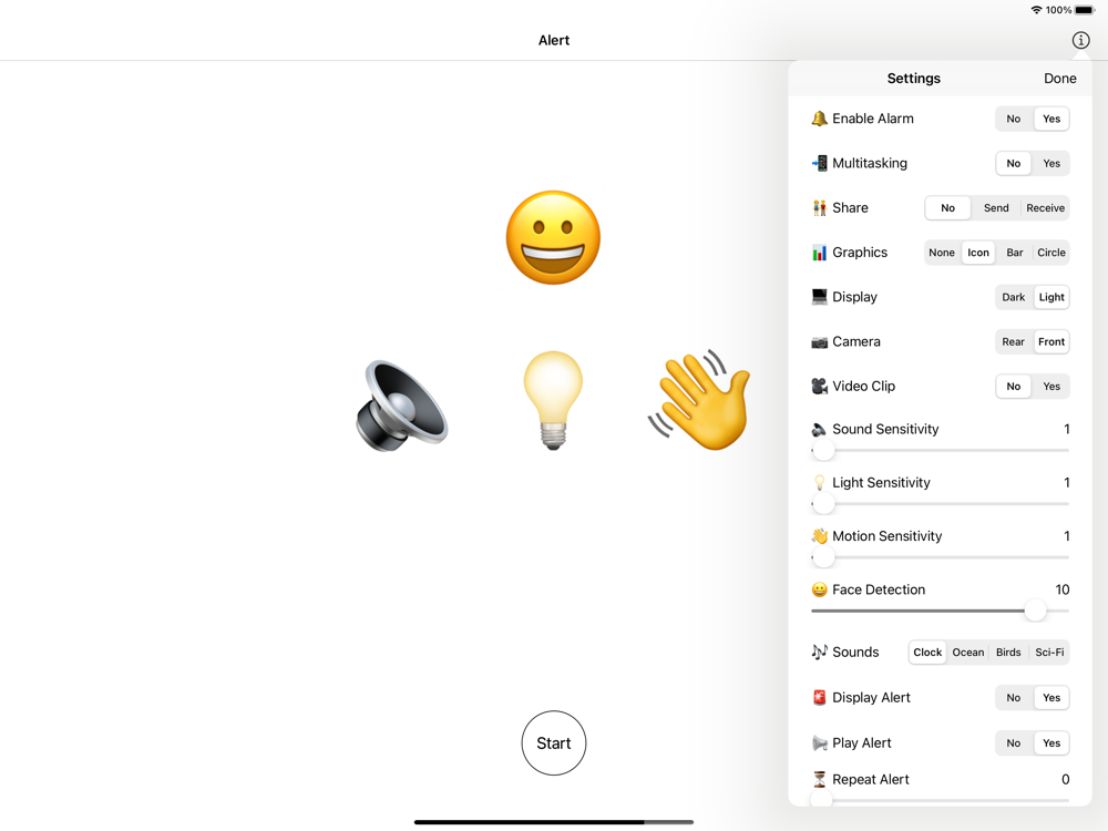 Alert triggers an alarm based on detecting people's faces or changes in sound, light or motion. When a trigger is detected you have the option to cancel, postpone or just let it sound an alarm. You control sensitivity to detect the slightest sound, change in lighting, vibration or even the number of people detected. At night time use Alert's dark screen and trigger the torch. Share alarms with friends using Alert to remotely monitor on an iPhone, iPad or Apple TV.