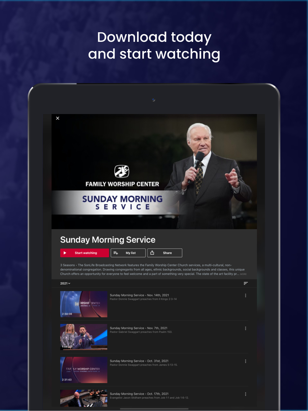 Watch the Sonlife Broadcasting Network live and on demand wherever you are! SonLife Broadcasting Network includes 100% original content produced by Jimmy Swaggart Ministries. The new SBN Now app includes the live stream in English, Spanish and Portuguese as well as Video on Demand! You can now enjoy programs like Family Worship Center Live, The Message of the Cross, Frances and Friends, A Study In The Word and The Classic Crusades right in the SBN Now app!