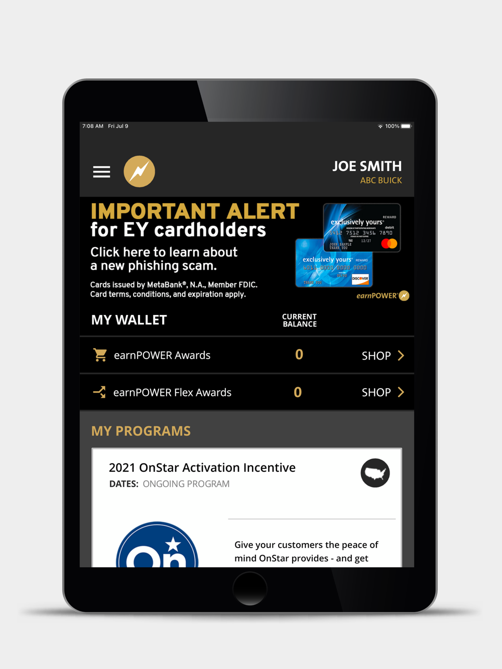 The primary function of this program is to allow participants to submit claims in earnPOWER when they properly activate OnStar on any qualifying pre-owned GM vehicle.