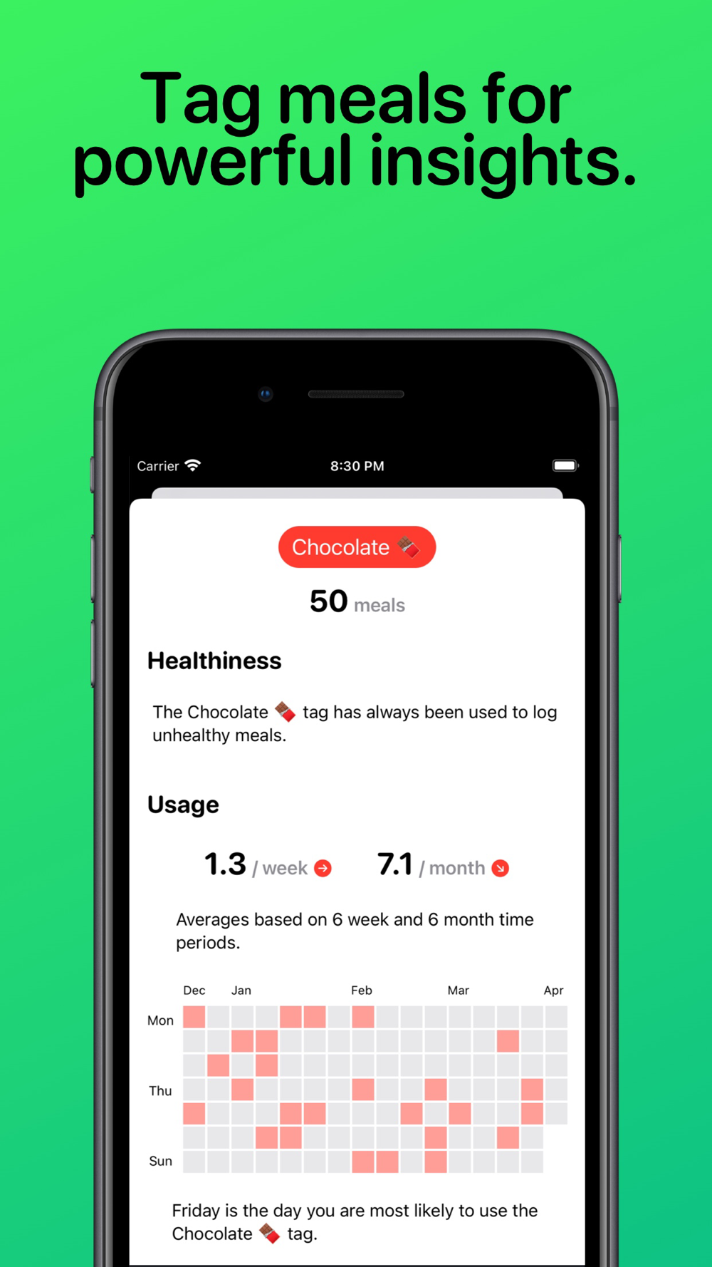 * Low carb? Gluten free? Chocolate? Use tags to optionally gain extra insight into your meals.