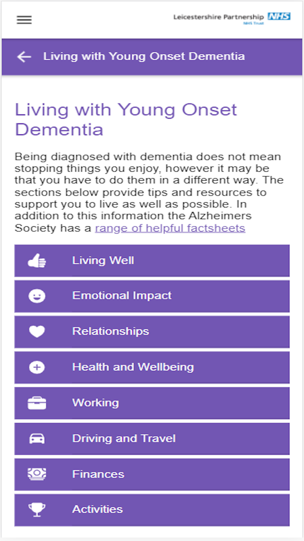 Ideally, this app can be presented to patient and carers at the time of diagnosis so that in their own time, patient and family members can use guidance to help them to manage all aspects of their life and more importantly signpost them to an array of services and organisations that provide specialist support and information, locally, regionally and nationally. Signposting within the service directory section is categorised, such as; finances, transport, employment, living well, relationships, etc. with contact details for these resources and links to websites such as Alzheimer’s society and YoungDementia UK.
