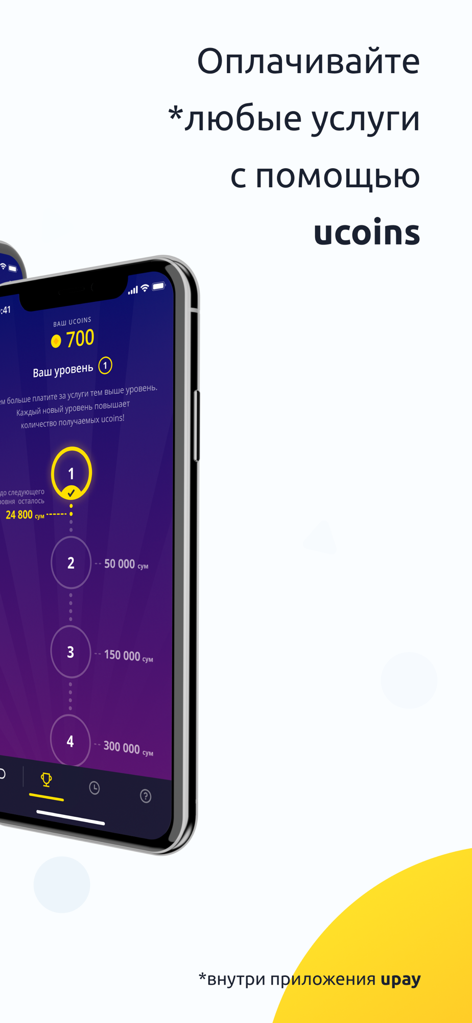 To'lovlarni amalga oshiring va UCoins shaklida Cashback ga ega bo'ling. UCoins bilan xizmatlarga to'lov qilishingiz mumkin.