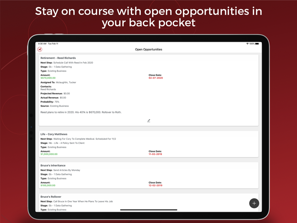 Using the Redtail CRM app, you can stay on top of meetings and opportunities and stay connected to your clients, your prospects and your team: