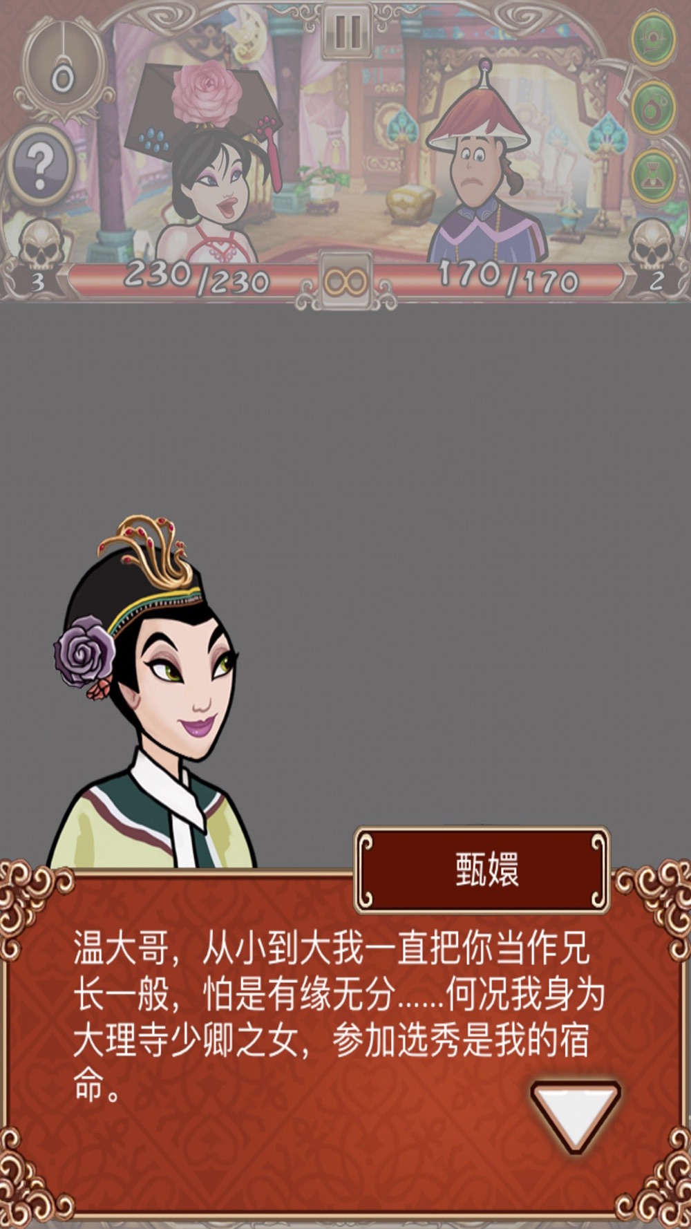 这是一款古穿越题材的休闲类角色扮演消除游戏,采用搞笑的卡通人物画风,游戏中加入了新颖的故事情节,增添了游戏的趣味!在消除过程 中可以给自己的人物加血,可以加金币,可以攻击对方,是一款休闲打发时间的好游戏,也是妹子们最爱玩的游戏哦!记住要闯关哦,后面还有 更精彩的内容!