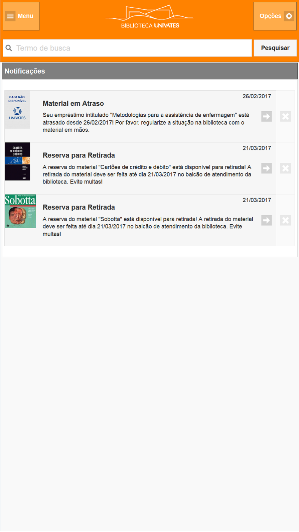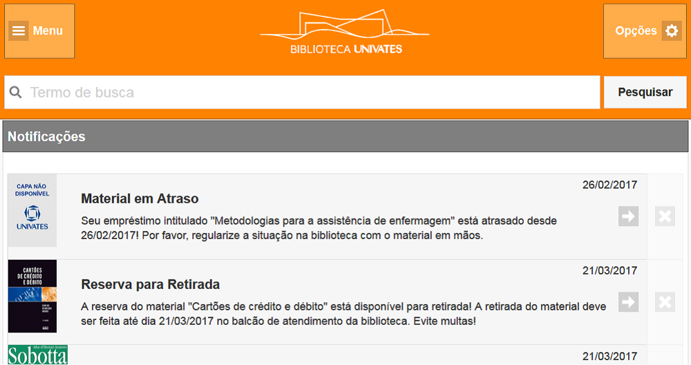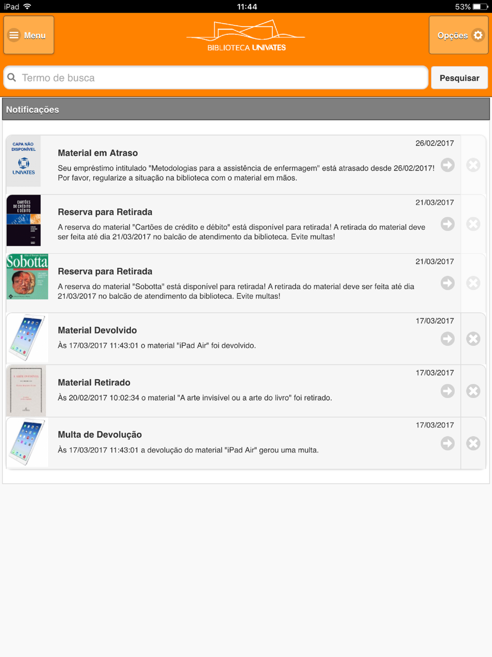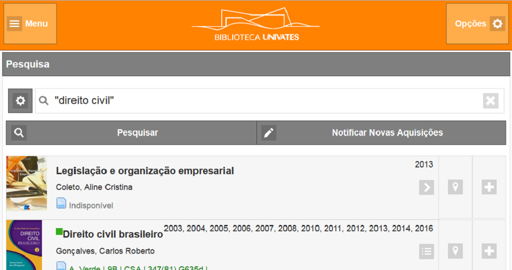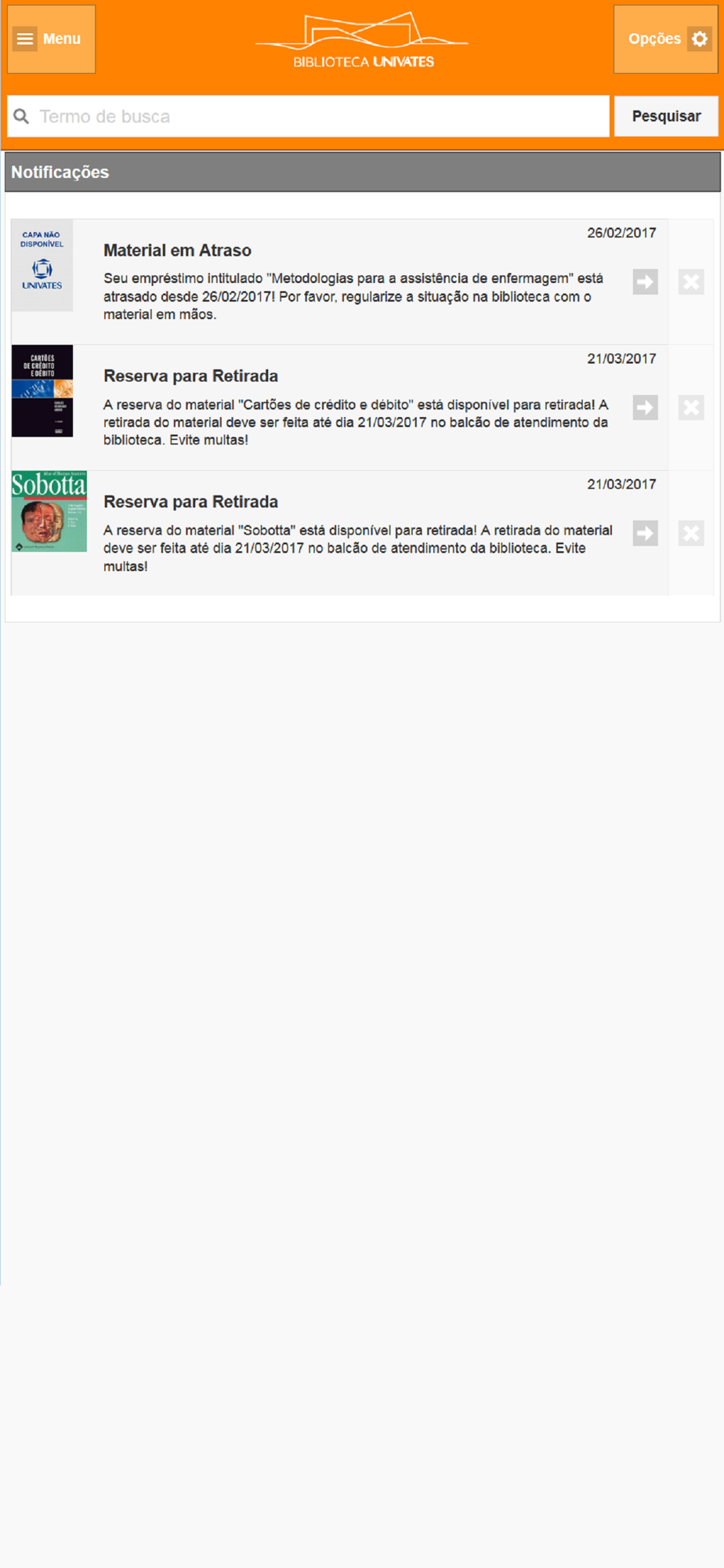 O aplicativo da Biblioteca da Univates permite você ter acesso as principais informações da biblioteca diretamente de seu dispositivo móvel. Este aplicativo notifica os usuários em relação a empréstimos para renovação, empréstimos em atraso, reservas para retirada, dentre outras informações relevantes da biblioteca. É possível também pesquisar diretamente do catálogo da biblioteca, visualizando as informações de maior relevância e facilitando a localização dos materiais através de um mapa do acervo. Nele você pode também gerenciar uma lista de materiais, visualizar reservas e empréstimos, assim como efetuar renovações, reservas e cancelamento de reservas.