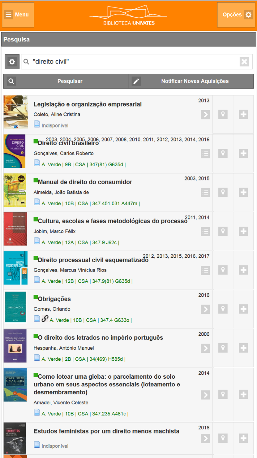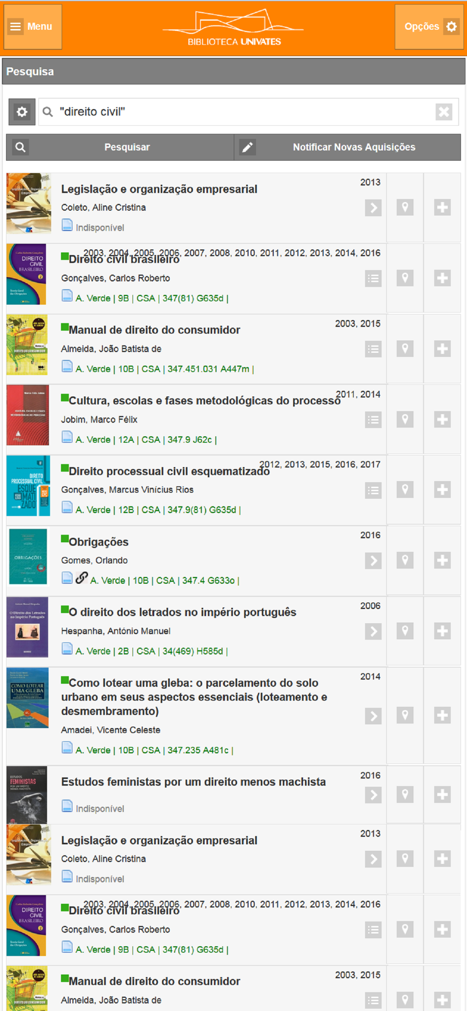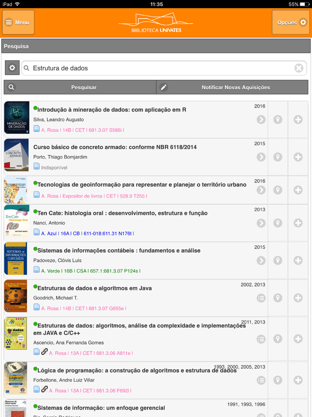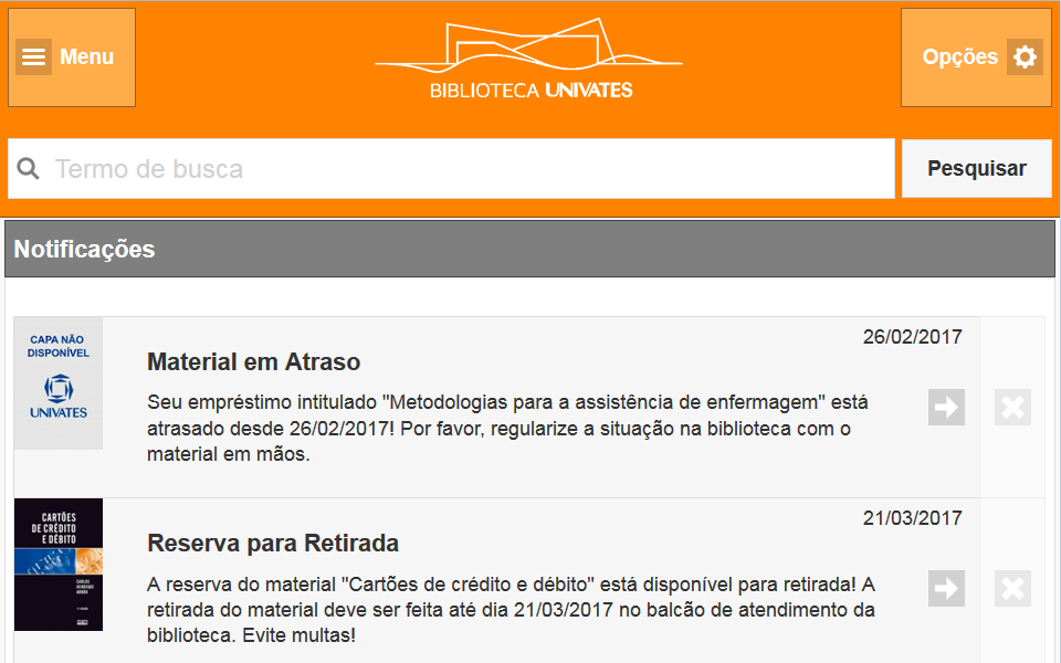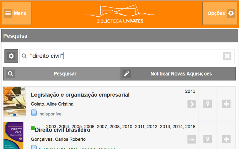 O aplicativo da Biblioteca da Univates permite você ter acesso as principais informações da biblioteca diretamente de seu dispositivo móvel. Este aplicativo notifica os usuários em relação a empréstimos para renovação, empréstimos em atraso, reservas para retirada, dentre outras informações relevantes da biblioteca. É possível também pesquisar diretamente do catálogo da biblioteca, visualizando as informações de maior relevância e facilitando a localização dos materiais através de um mapa do acervo. Nele você pode também gerenciar uma lista de materiais, visualizar reservas e empréstimos, assim como efetuar renovações, reservas e cancelamento de reservas.