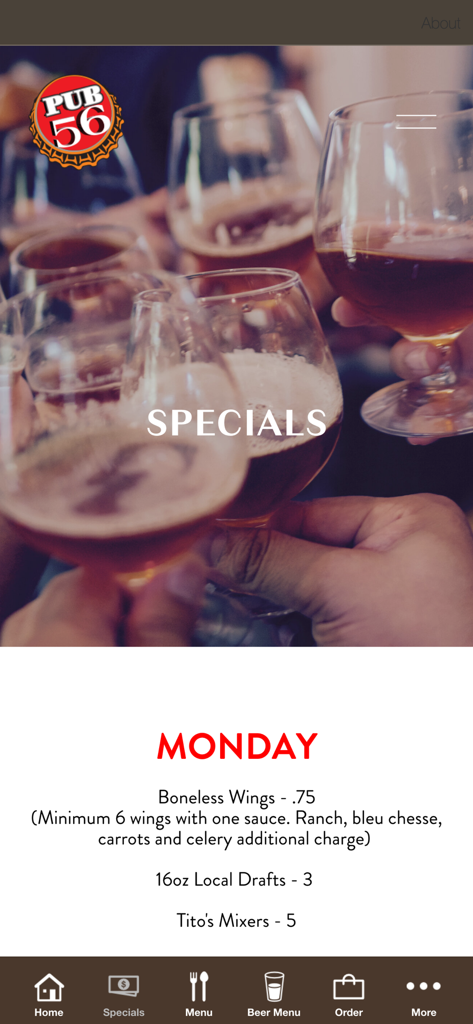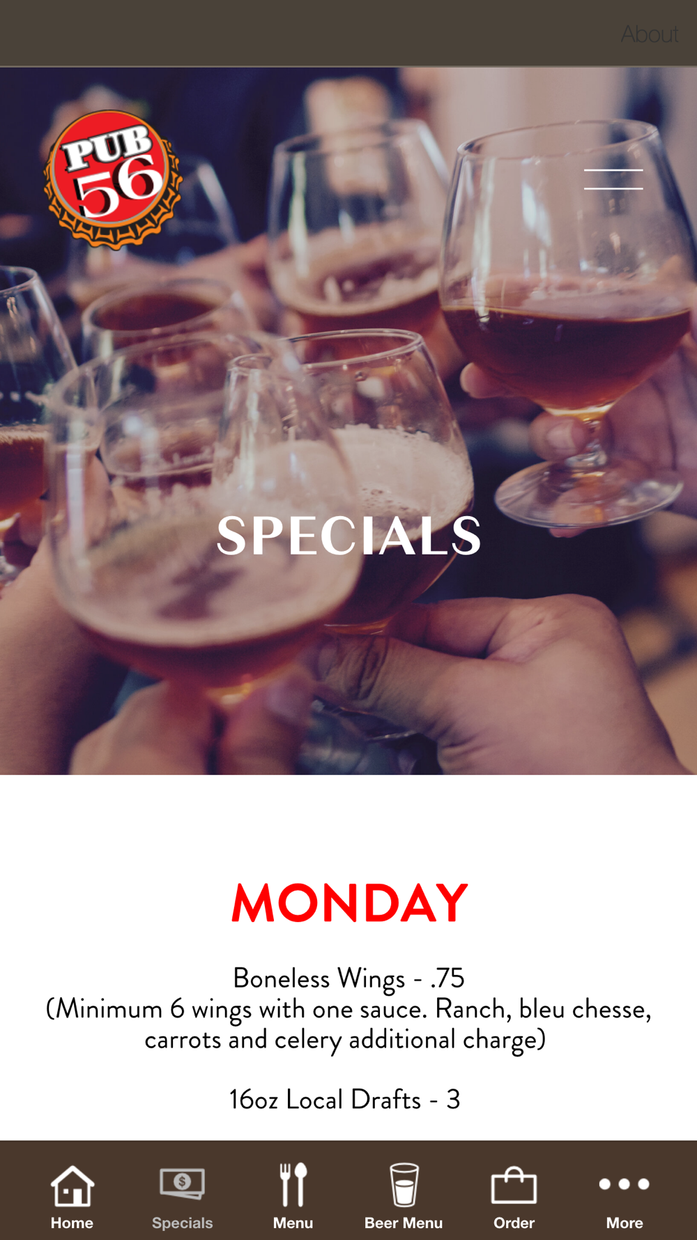 Pub 56 is anything but your average sports bar. Their beer menu is quite extensive, offering over forty-five domestic and craft beers. The environment at Pub 56 is perfect for any sporting event with multiple high definition, flat screen TV’s. While watching the game, you can enjoy their traditional American fare. Pub 56’s gourmet and upscale bar food is sure to please your taste buds. Download our app to view our menu & daily specials, view our events, get special offers and more!