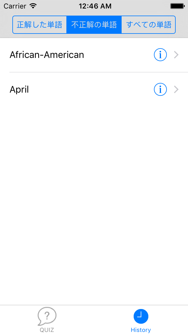 不正解だった単語は自動的に不正解リストに保存されるので、いつでも復習ができます。