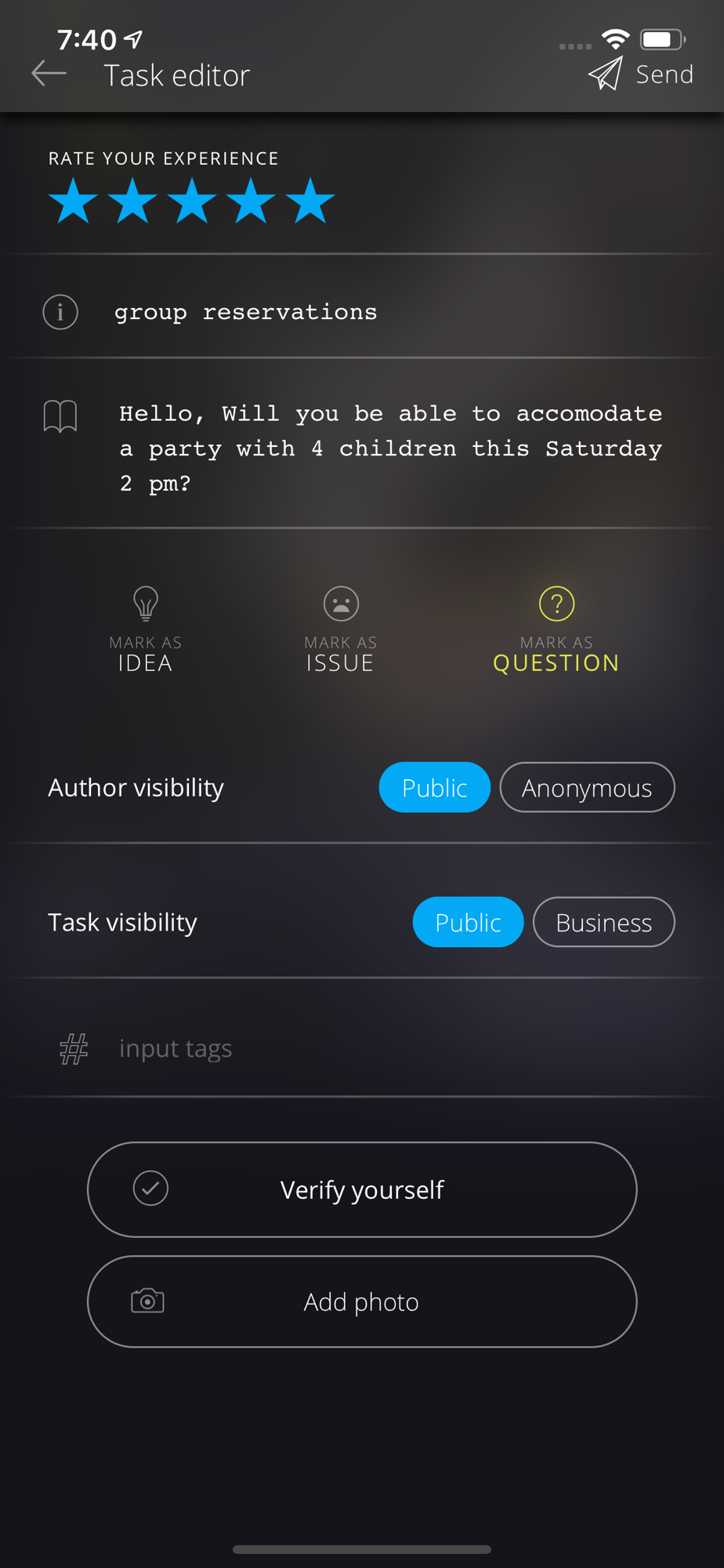 - Write your task directly to business and mark it as an idea, issue, question or just write about your experience and rate it.