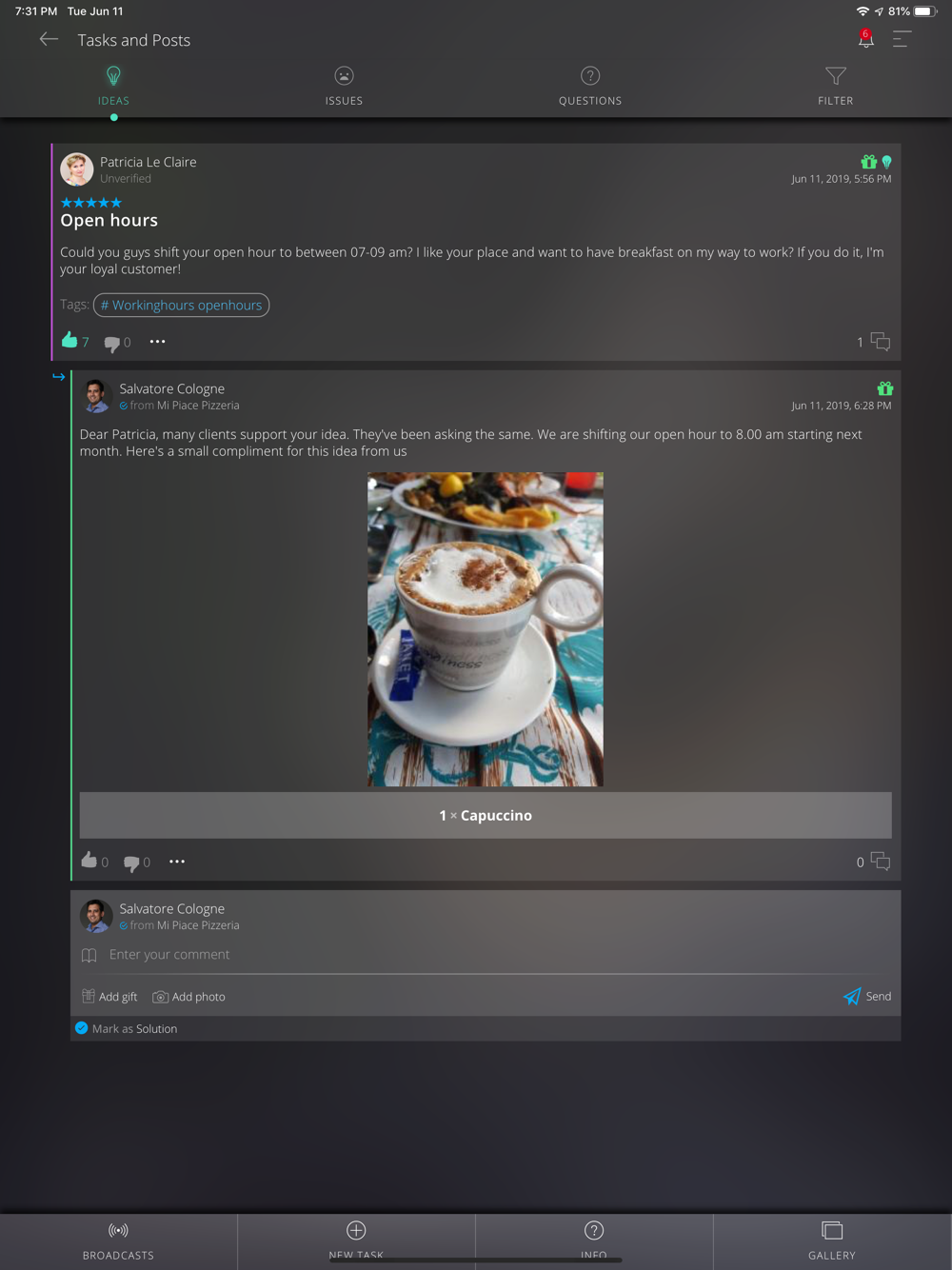 You can create tasks for a local business, for example, "I want to buy your great coffee on my way to work, but the cafe opens too late. Please, shift your open hours to 7 am". Other clients can vote for the task. Business can offer a solution, thank you for this idea and give a gift. Anyone can rate this solution. So business rating depends on how they treat their clients.
