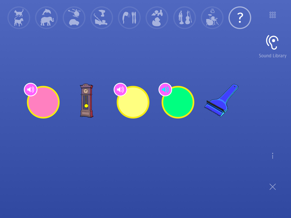 The sound library presents all the sounds sorted by sound category. The children can either rummage in the sounds, reveal the images or solve a small sound puzzle.