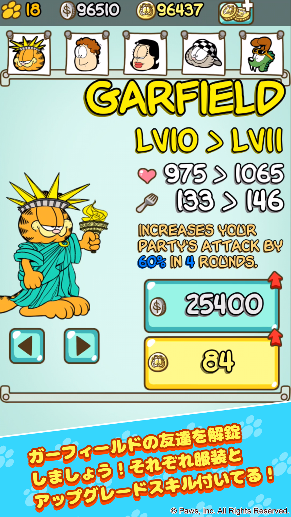 三つ以上のタイルを消して強い攻撃を仕掛けます。消せば消すほど攻撃が強くなります。コンボが色んな効果があります。ガーフィールドの友達はみんなスペシャルスキルを持ってます。その中にキャラクターを選んであなたのチームをカスタマイズしましょう。