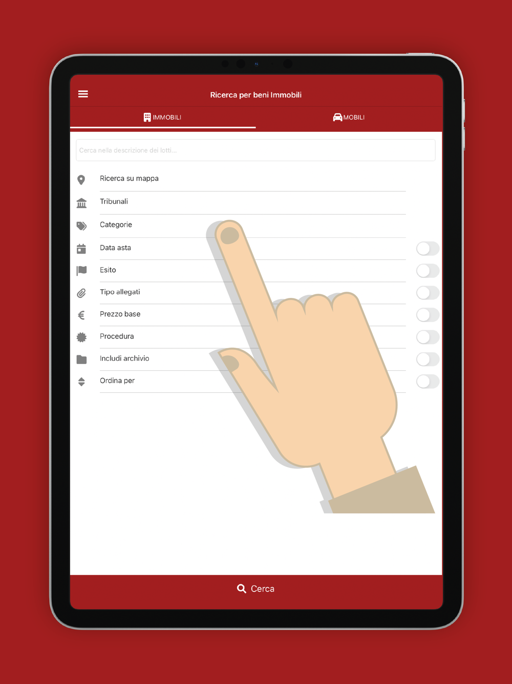 Ricerca le aste sulla base della posizione degli immobili, della categoria(Abitativo, Box, Azienda, ecc.), del loro valore, della data dell'asta o del tribunale a cui fanno riferimento.