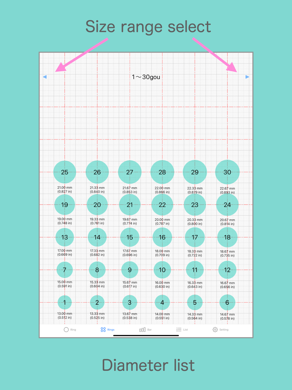 -Displays a list of circles (inner diameter of the ring) within the displayable range.