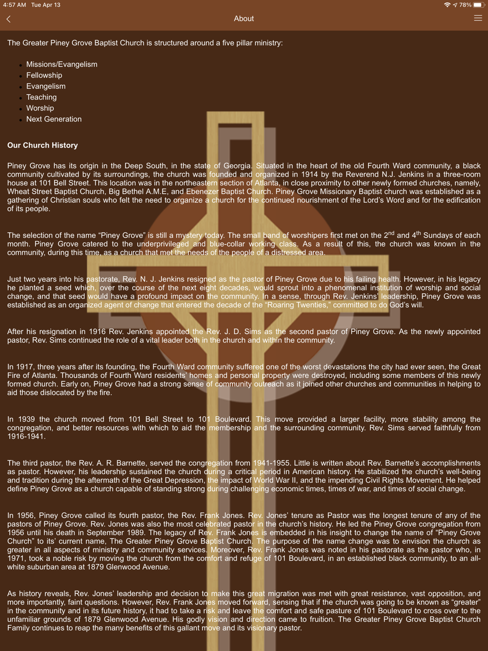 The Greater Piney Grove Baptist Church app can be used to connect to the prayer line, view the church bulletin, watch streaming worship services, connect with social media, and much more.