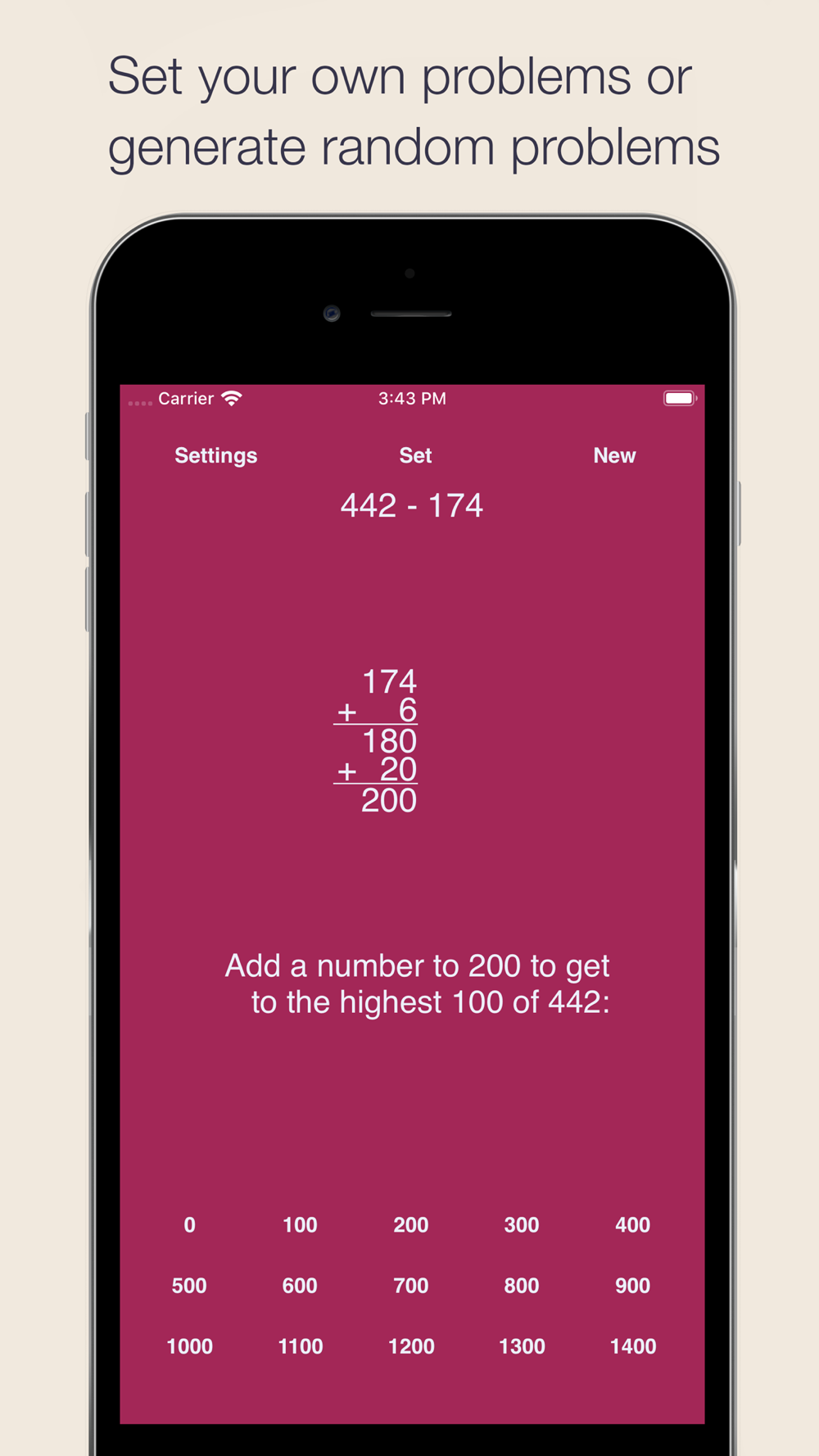 The counting-up subtraction app lets students solve subtraction problems by counting up from the lesser number step by step. The first step is to get to the nearest multiple of 10. Then to the next higher 100 and so on until the greater number is reached. The count-up amounts are then added together to get the difference.