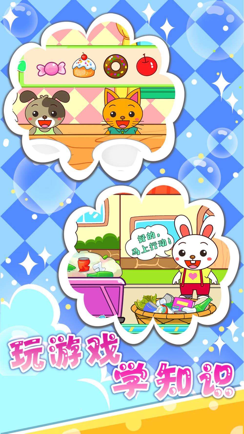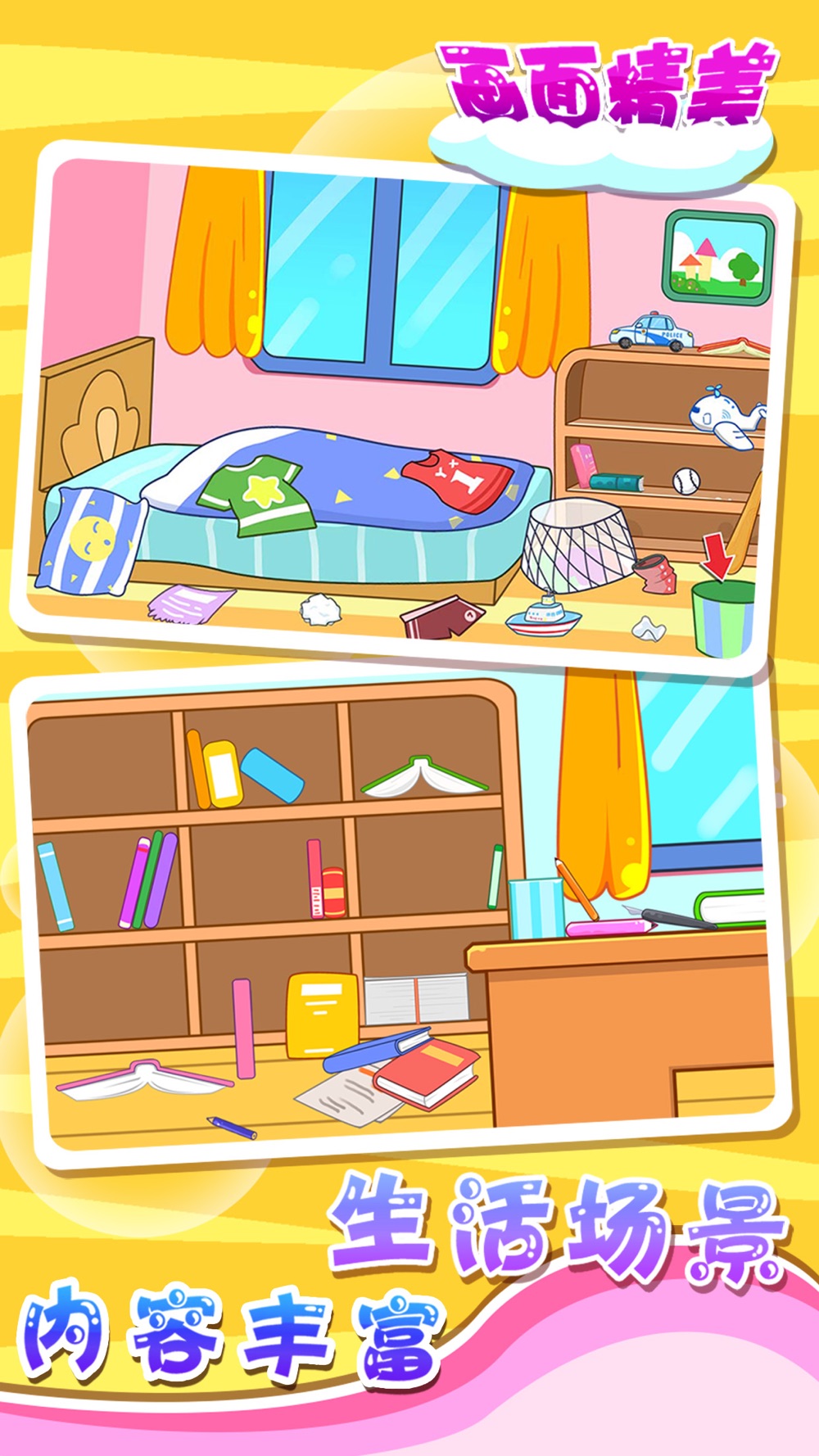 宝宝爱做家务是根据最新的幼儿教育方案设计的一款引导宝宝做家务的早教游戏,有趣的游戏涵盖更多的事物认知,同时培养宝宝爱收拾的好习惯。精美的画面,趣味的动画,模拟真实生活场景,让宝宝在游戏中学会做家务,升级能干的妈妈小帮手。