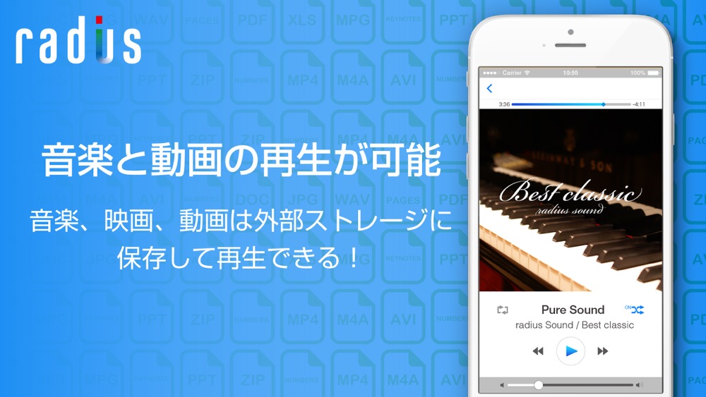 音楽、動画、画像、書類、その他のファイル合わせて30種類以上の使用頻度の高いフォーマットの閲覧に対応しています。色々な専用アプリを立ち上げなくてもDATA-BOXがあればアプリ1つで対応できます。