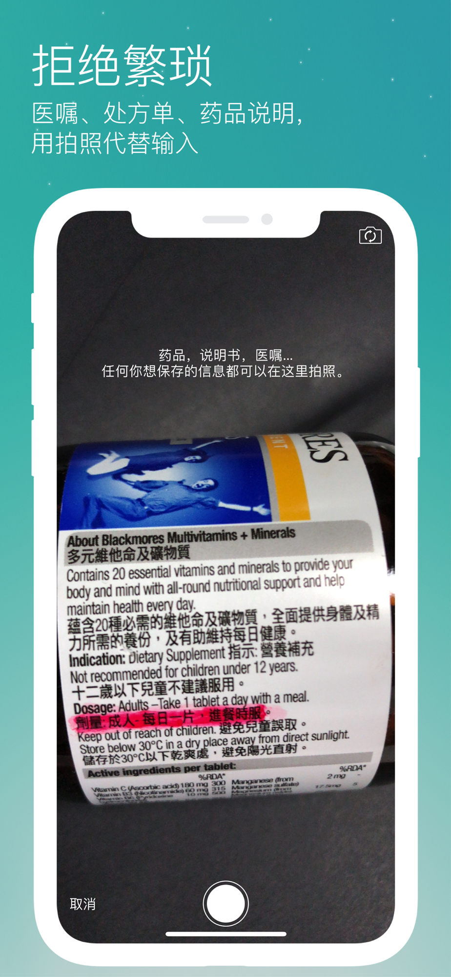 【化繁为简】 药品说明、医嘱、处方单,一键拍照记录保存,无需繁琐输入