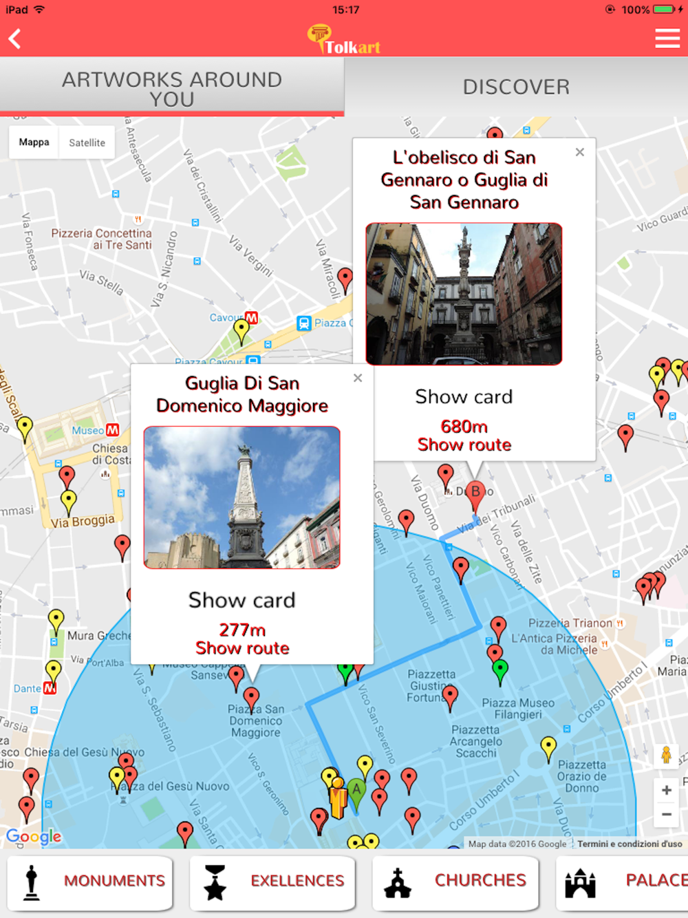 The entire visit is supported by the use of an interactive map that indicates all the events and places of art available and accessible both in "Catalog" mode (divided by sections) or live mode with a "Smart" visit based on the user's proximity. In this way, in the most interesting sites, the visitor will be stimulated by the surrounding works that they will propose with their multimedia content, becoming an active part of the whole experience fruition. In addition to the different ways of use, for different events "Guided tour 3.0" will be available, which will guide you through the entire visit on the basis of designed routes.